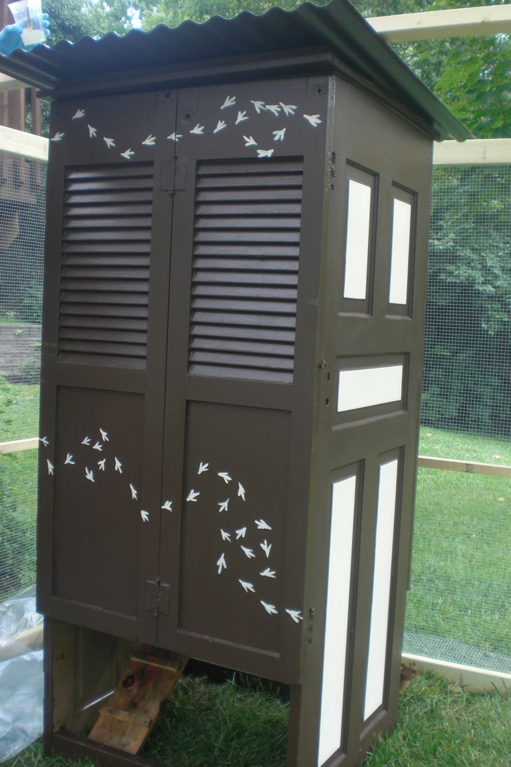 The coop is about 6'6" tall and about 3'6" x3'6" inside. It is made from 2 solid wood panel doors and 2 shutters from the Habitat for Humanity ReStore . Those shutters are screened on the inside to keep bugs out, but I think they'll allow plenty of ventilation. The hardware, floor and roof and most of the wood were reStore, salvaged or free.