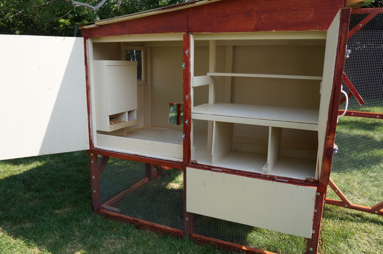 The front swings open on a hinge for us to access. The birds will come and go through an opening in the floor with the ladder. (I think the opening may need to be larger, and the angle of the ladder may need tinkering....)