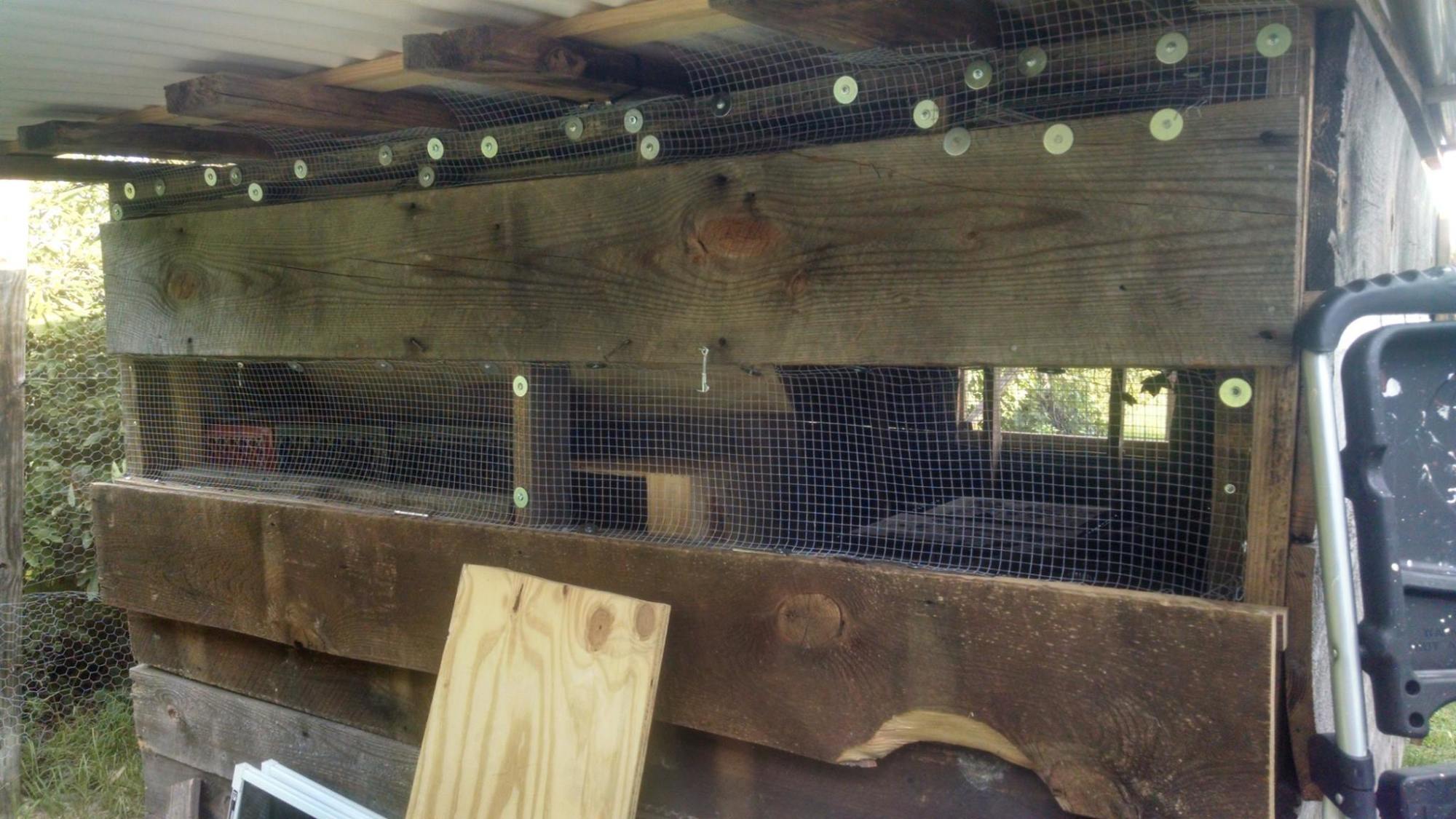 Really missed my grands today. They had helped me so much getting my coop chicken ready. Today I got a couple of things accomplished. I covered the back egg door with hardware wire so I could leave it down with the heat...since I haven't gotten a run done yet. Also had to switch out the slanted board that I had over the nest boxes.....it wasn't slanted enough to keep the chickens from roosting on it. I also added another higher but shorter roost. I have been allowing my lone EE free run of the coop during the day and then back in the kennel at night. Did so well with the younger girls today that I might leave her out tonight also.. She's been in the same coop with them for about 4 days. I think it helps that there's one of her and 6 of them! LOL....Here are a few picts of today's progress...just keep in mind that I have NO building experience so I'm just trying to make it more predator proof...I have more to do. Don't laugh! the top part of the top board had a crack in it at the top right side. So I added a few more screws....Might be an overachiever when it comes to screws and washers!!
