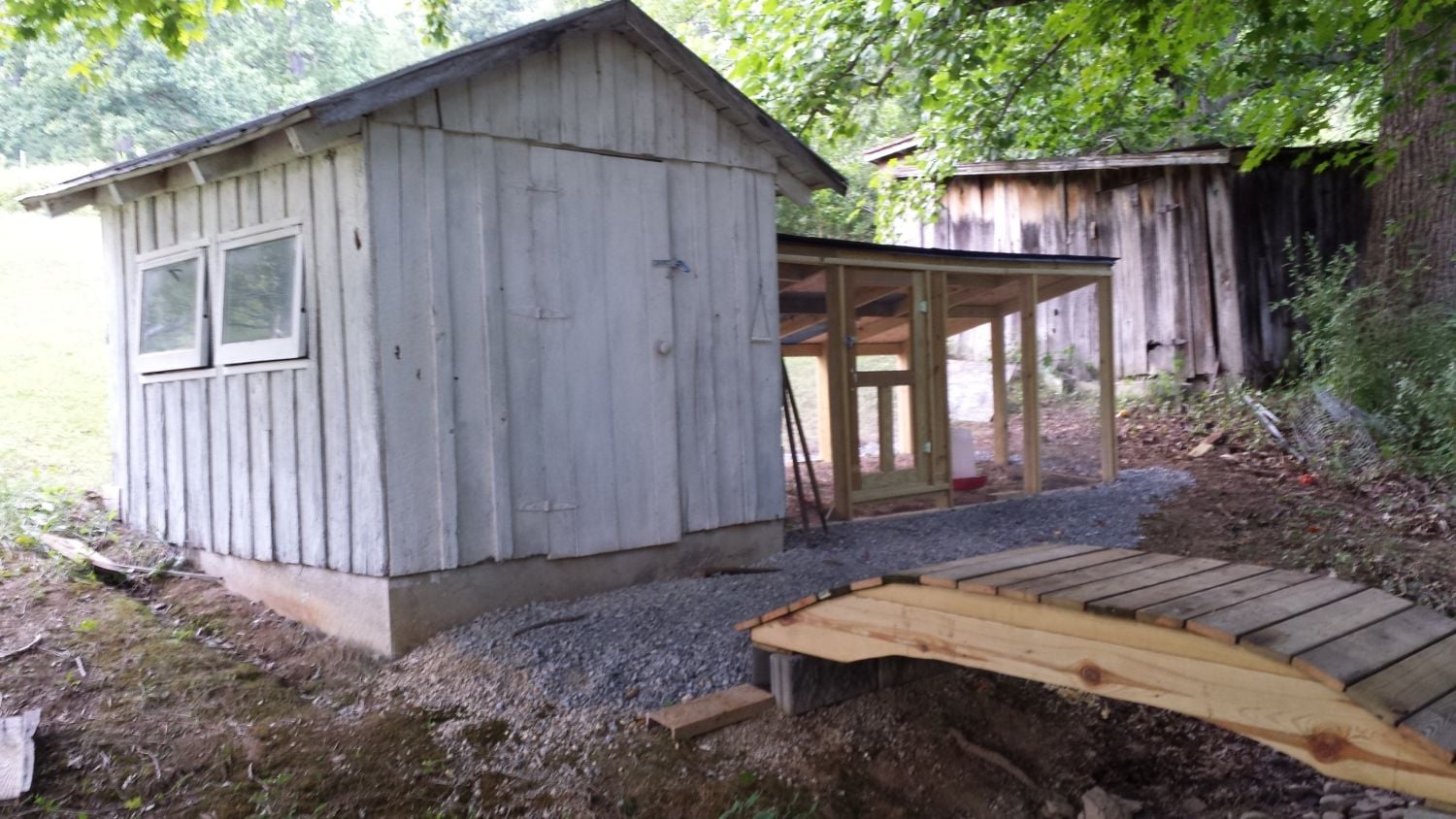 Loving your building and how you are reusing this building.....how cool but a lot of work... I think its great!!Got my coop in useable shape. This is a conversion. The original building is a 100+ year old, old growth chestnut, smokehouse moved to this location from the old family homestead. The windows are from the old farmhouse as well. Took a lot of cleaning to get it ready. Lots of old curing salts. Pressure washed the interior. Still had the brass meat hooks inside. It's roughly 8'x8'. The run is 12'x9' with 1/2" hardware cloth. I also have a 10 slot nesting box we salvaged out of the old family chicken coop. Coop still needs another coat of paint and the wife wants to put some colored trim around the windows. Guillotine uses two pulleys and I used 550 paracord with 1/2" pvc for a handle. It's to the right of the door. You pull it down and hook it on screw to leave it open. Wire in-ground around the outside of the run covered with gravel. I think I'm going to put wire on the ground in back of the coop as well. Already have things sniffing and digging back there but there's a raised concrete curb on the inside so they'd have to pull the boards away. Also has LED solar light inside for after dark inspection. Solar panel and egg access door are around back.