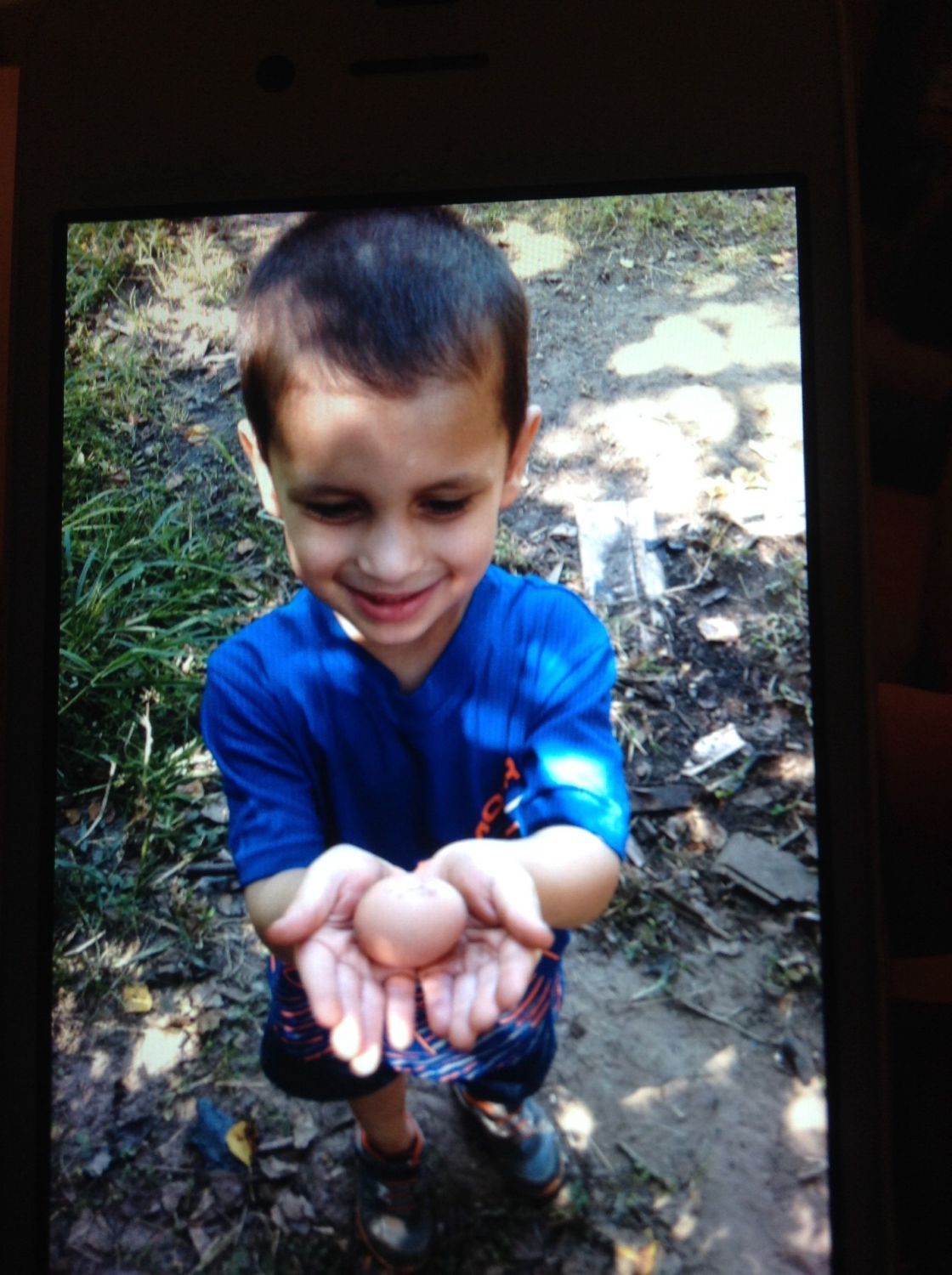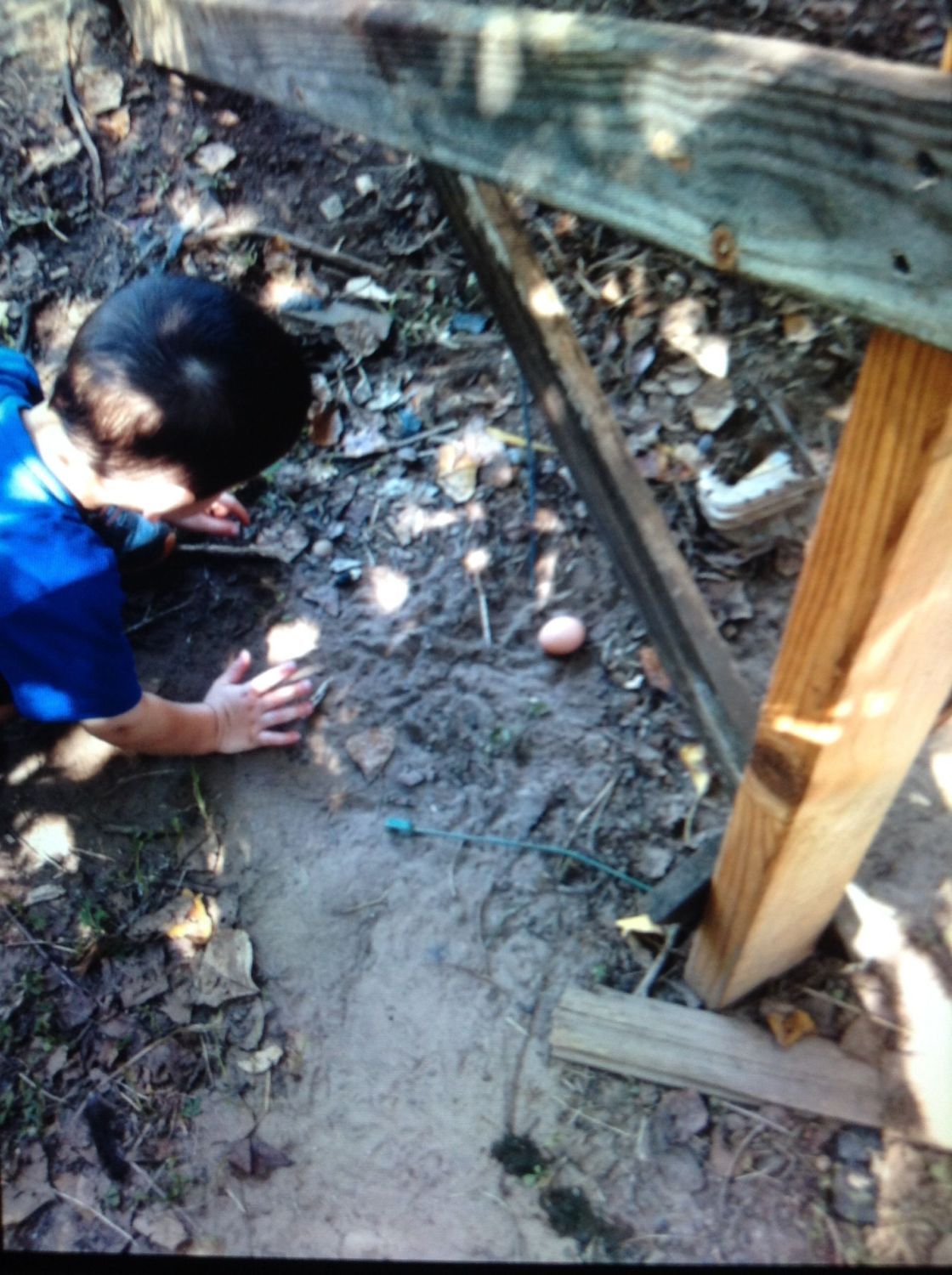 My little man found his first egg today!!! He saw it and crawled under the coop to get it lol...