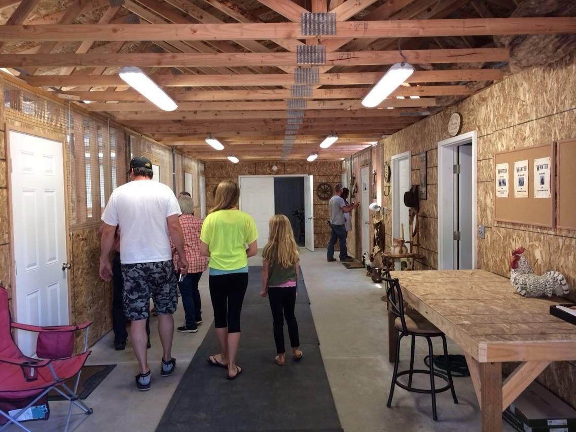 6 stalls - 4 10x10 and 2 12x12 - 1 12x12 is for her future mini goat- rest is all chicken