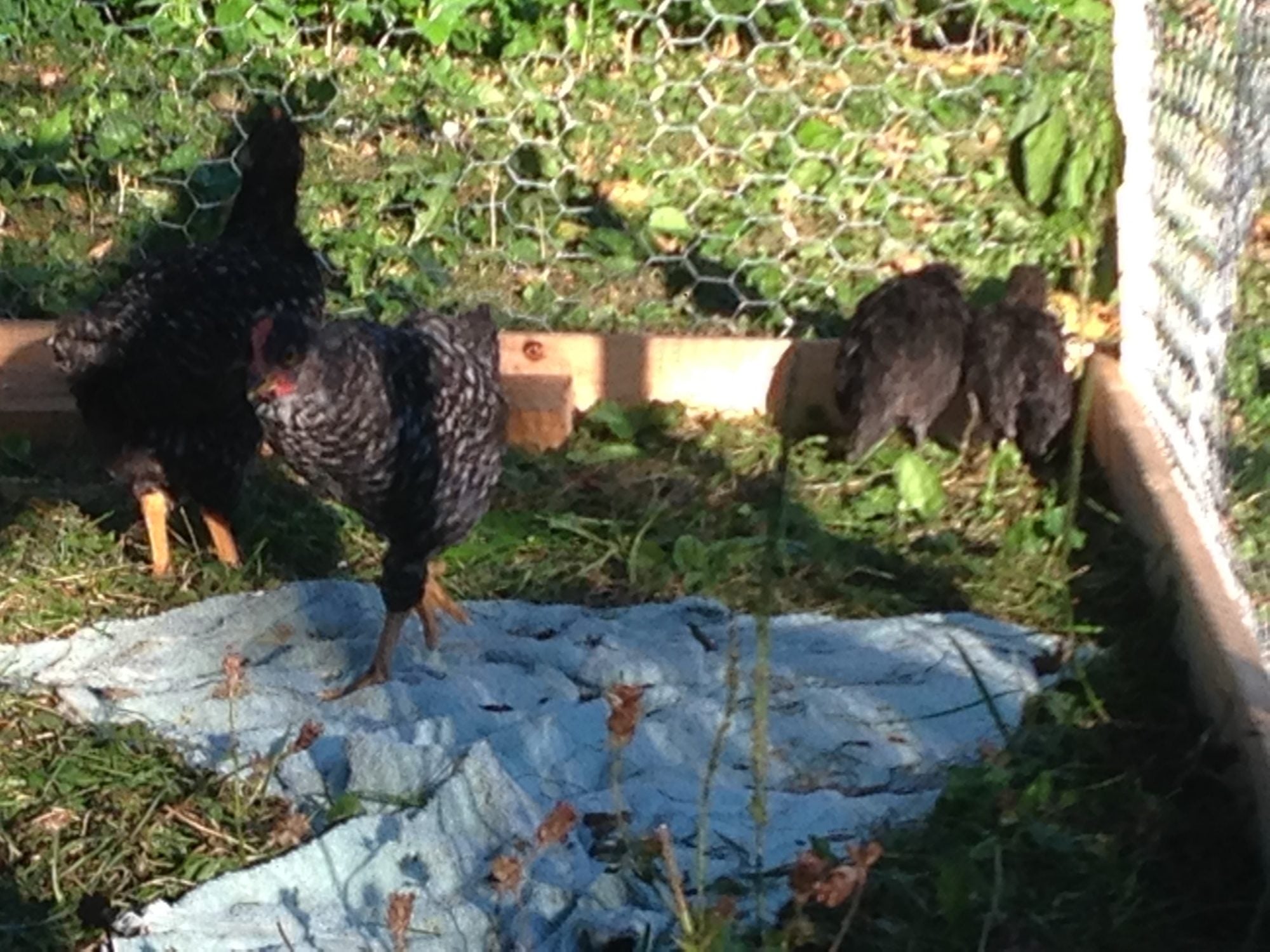 I grew up raising 100-150 hybrid meat chickens each year. We always kept 10 or so around through the winter for eggs and would start again each spring. About three weeks ago our neighbor brought us four chicks from her dad's farm. Two Barred Rock and what appears to me to be two Black Japanese Bantams. My 8 yr old and 6 year old daughters love them and have turned into good little mothers. I built a mobile run, closed in on all sides and the top but portable so they get fresh bugs every now and then. My little coop is an homage to my great grandad, it's built entirely out of found items. Hope you enjoy our pictures!
