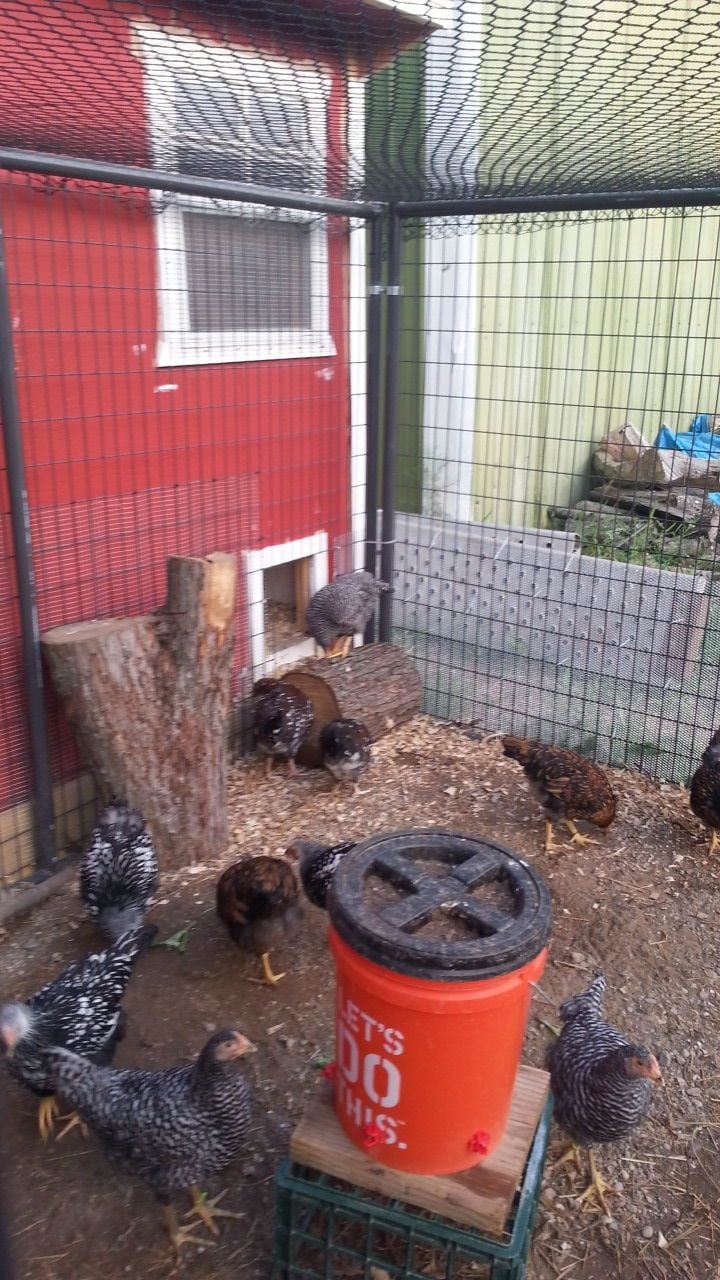 Added a stump for step down out of coop. The girls seem to love it and it came with a bug buffet.