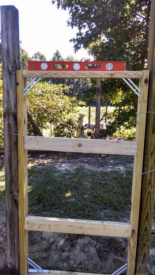 Well, yesterday I thought I had the last post in the ground!!! Hahaha... Grabbed by door that I'm so proud of and realized it needed a frame to set in.. I have to set the board underneath but got the pole on the other side set and used the door and other pole to keep it level..got a lot of work to do with the run. Unrolled the 25' of 1/4" hardware wire,got it folded so there will be 12" outward and got that roll attached with screws and washers.. 25' didn't go very far.. boy this run is going to break me $$ wise..!!!