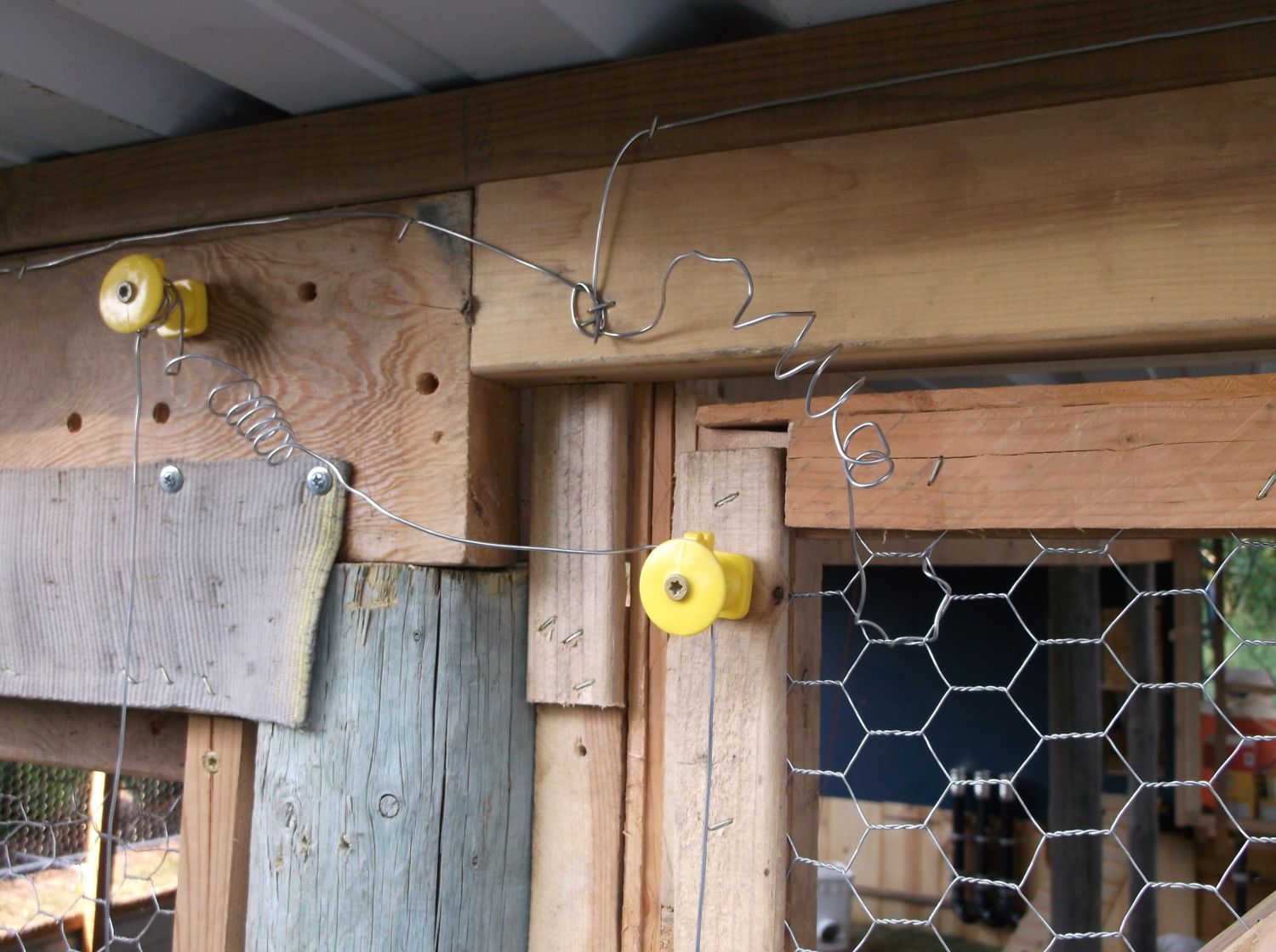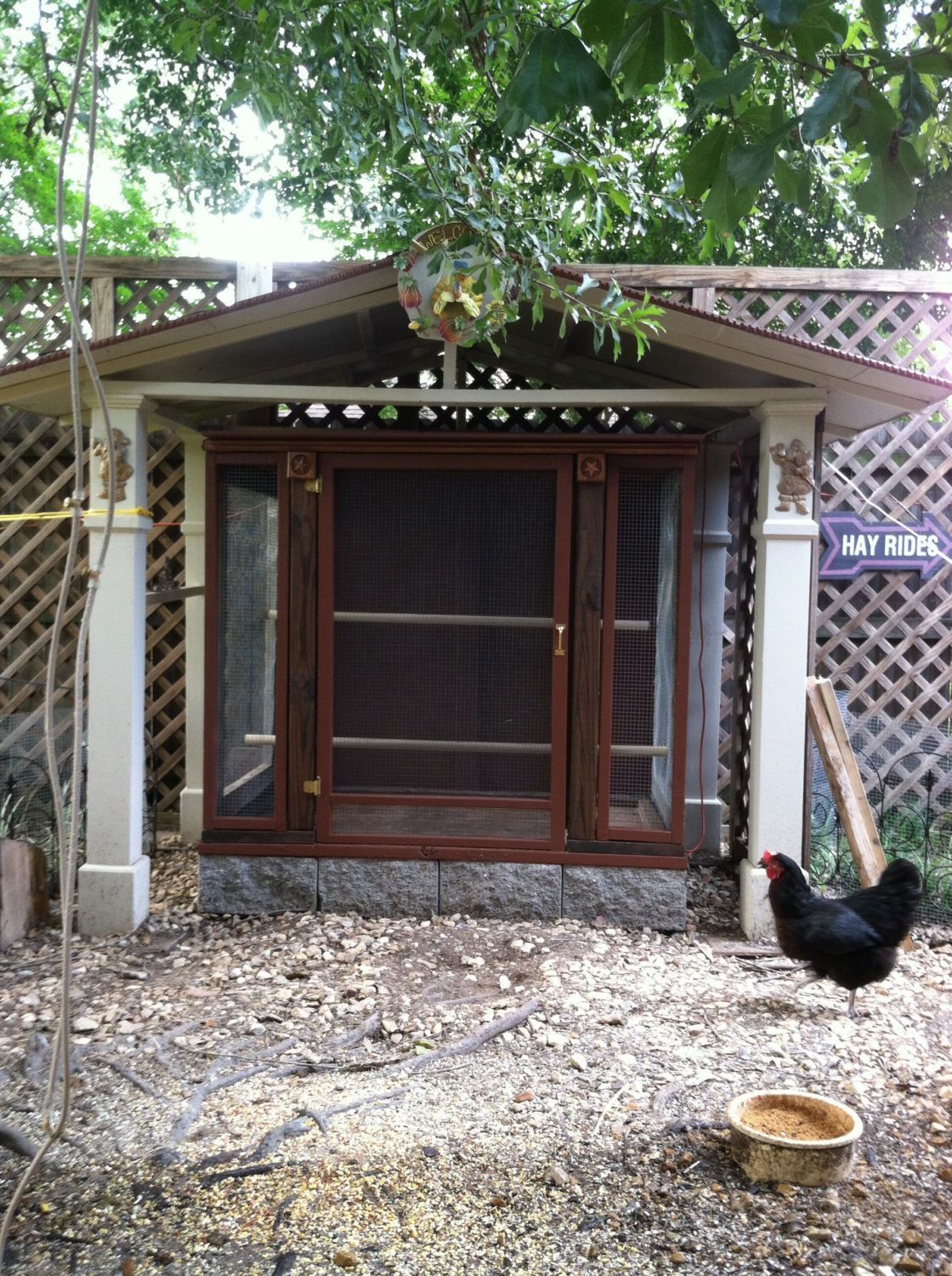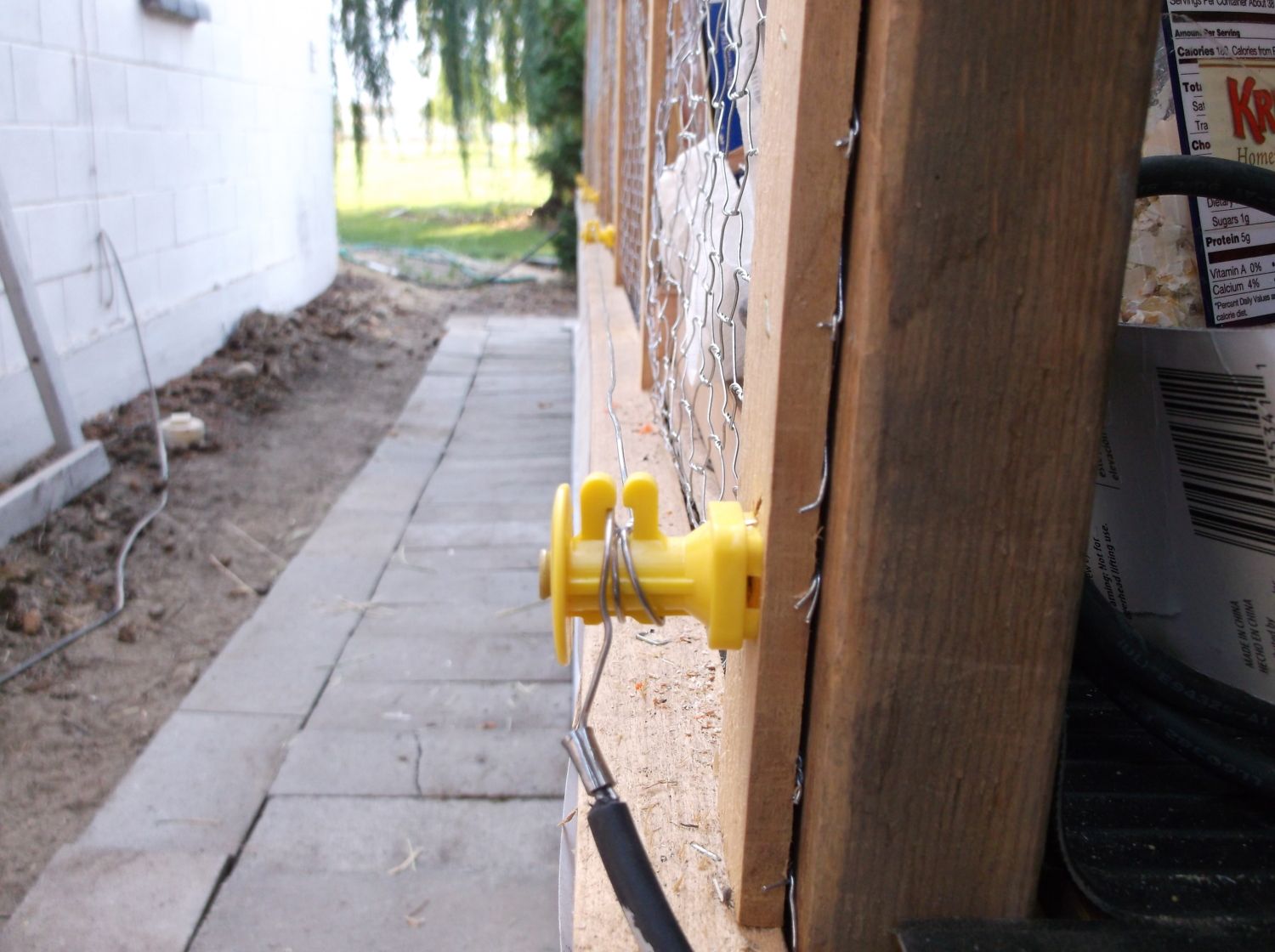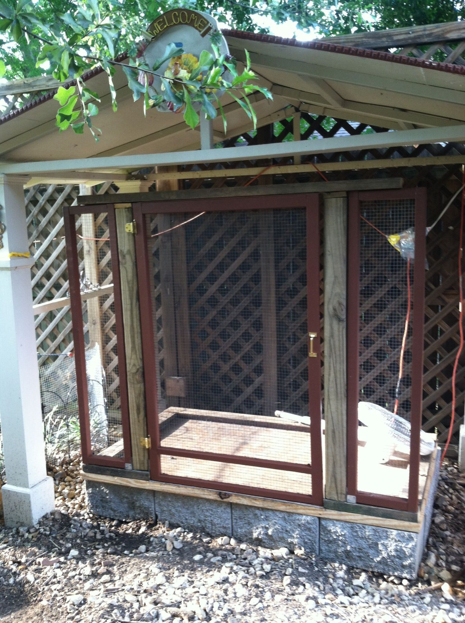 I bought a cheap screen door on sale at Lowe's and cut off the bottom. I painted it and added hardware cloth. I then made panels for the front, painted them and added hardware cloth. I put some old heavy posts to reinforce each side of the door.