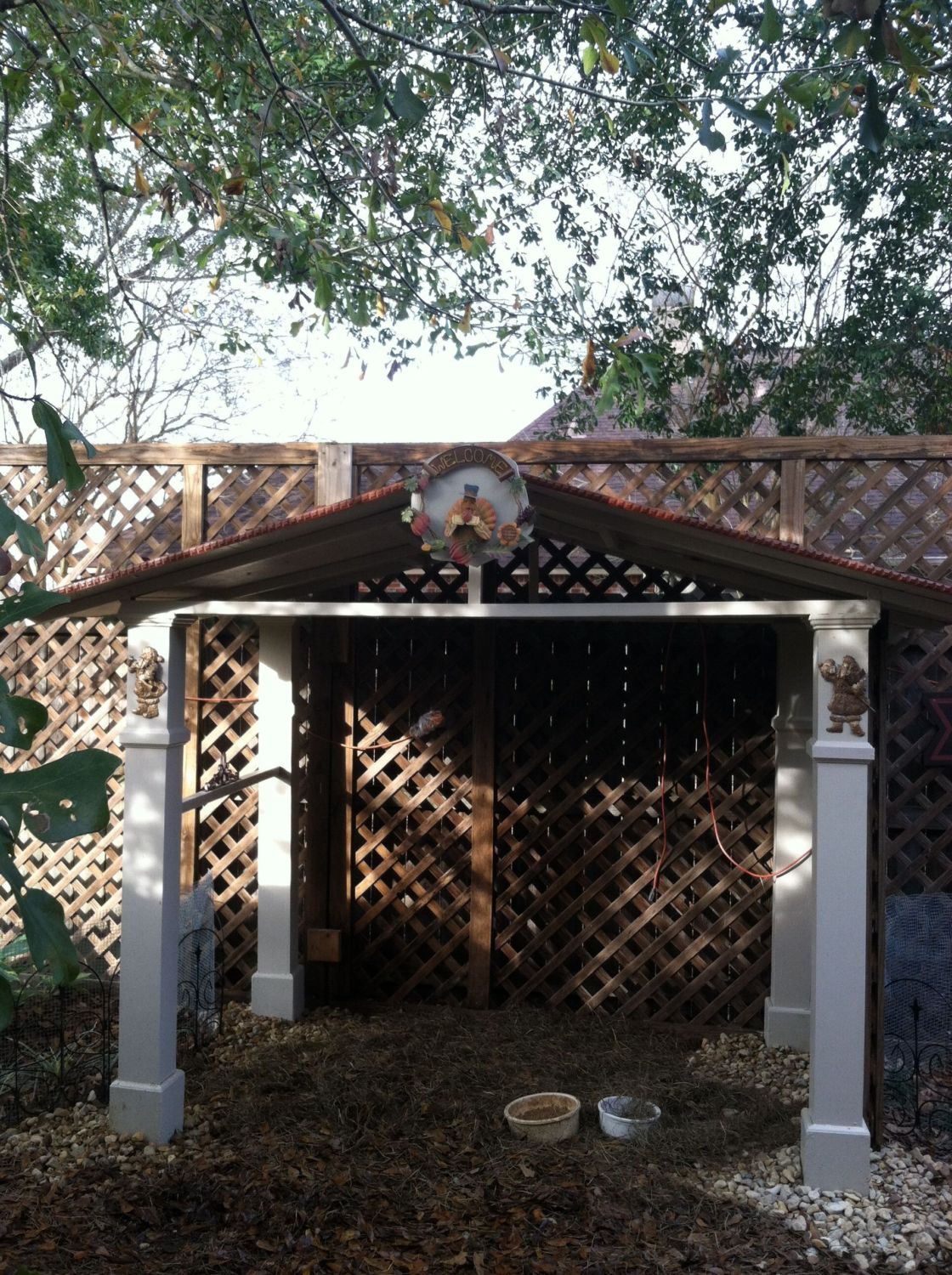 The coops on here are fabulous. I'm a little embarrassed to post mine. When I turned 66 I retired. I already had my chickens. I had two very small bought coops that I had under a canopy to keep the rain out. When the canopy started to dry rot I had the thought to build a canopy out of wood and shingles. I found some posts on the side of the road and that started it.