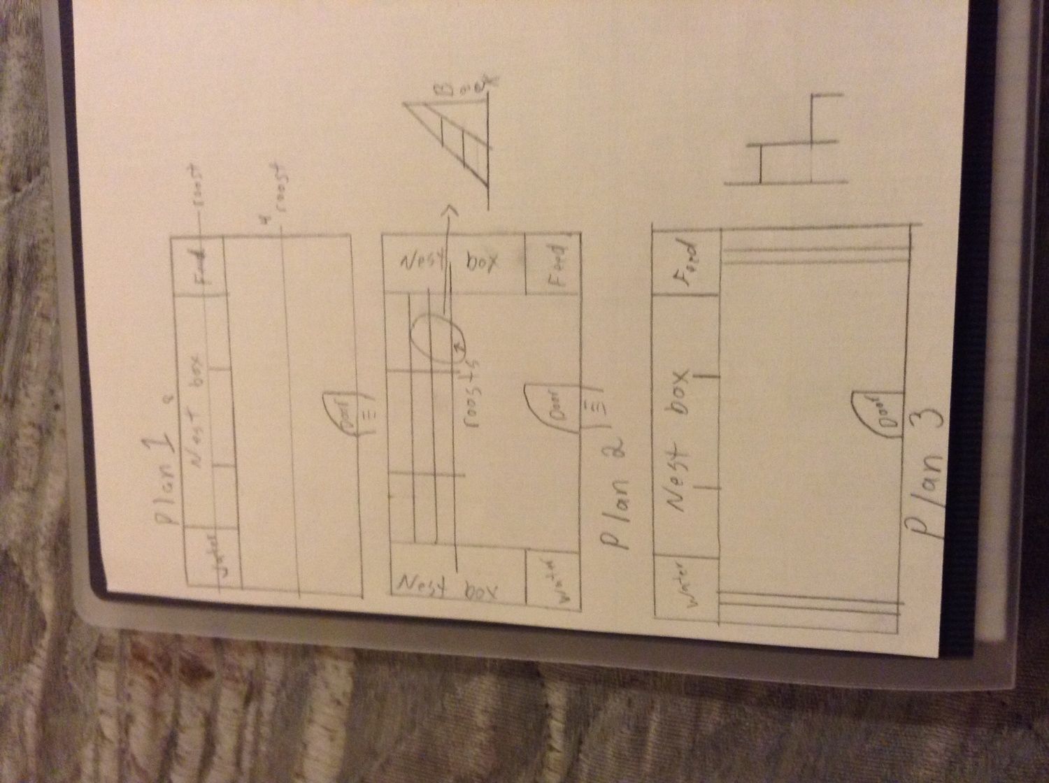 As far as I can tell, this is the basic layout that my husband has in mind for our new coop... He told me to come up with the interior plan but to keep in mind that the front will be screen with a removable wall for colder weather... I've come up with 3 plans... Can I get some input? He said he would rather the nest box be against the back wall that will tie into our shed... But on the sides would be ok as well...