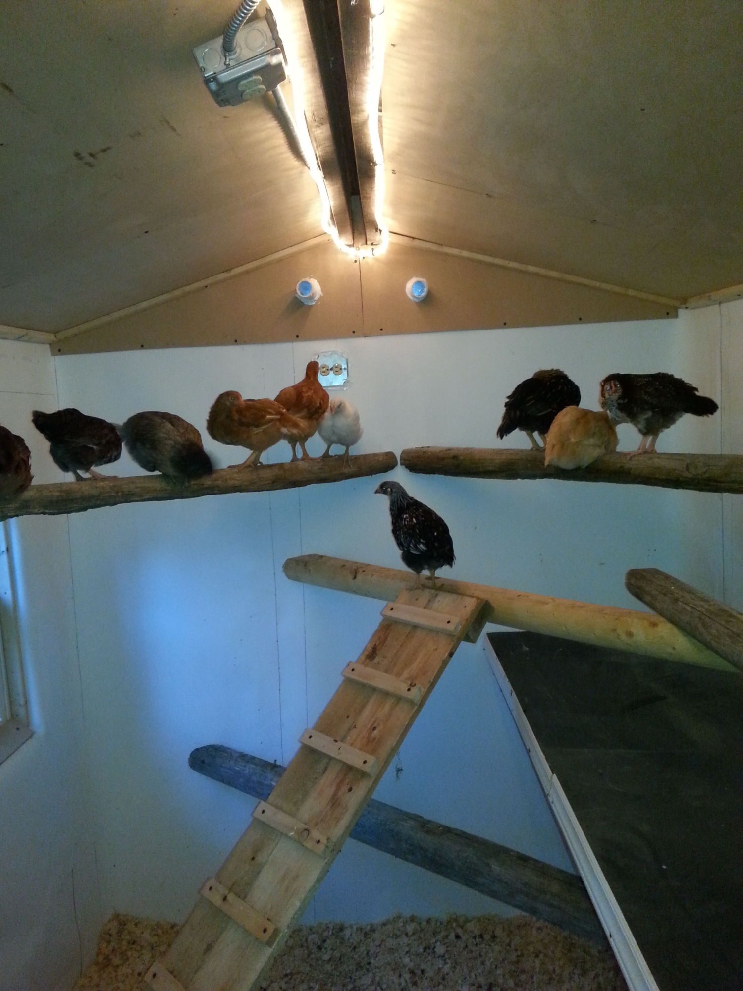 2. The roost I see (is it a roost?) across from the nest boxes appears to be a 2 x 4 on edge. For bird foot comfort, you should really turn it 90 degrees so the wide side is up. Chicken feet aren't really designed for gripping like wild birds. I'm not saying they "can't" grip... just that that's not what their feet are primarily designed for. They're really designed for standing on & scratching in the dirt for goodies. That will allow them to settle down at night and cover their feet with their feathers. That seems pretty high also so you may want an intermediate level roost to make it easier for them to be able to get up there. With 14 birds all trying to get up there the way it is now, the later ones flying up might knock off some of the birds already up there.