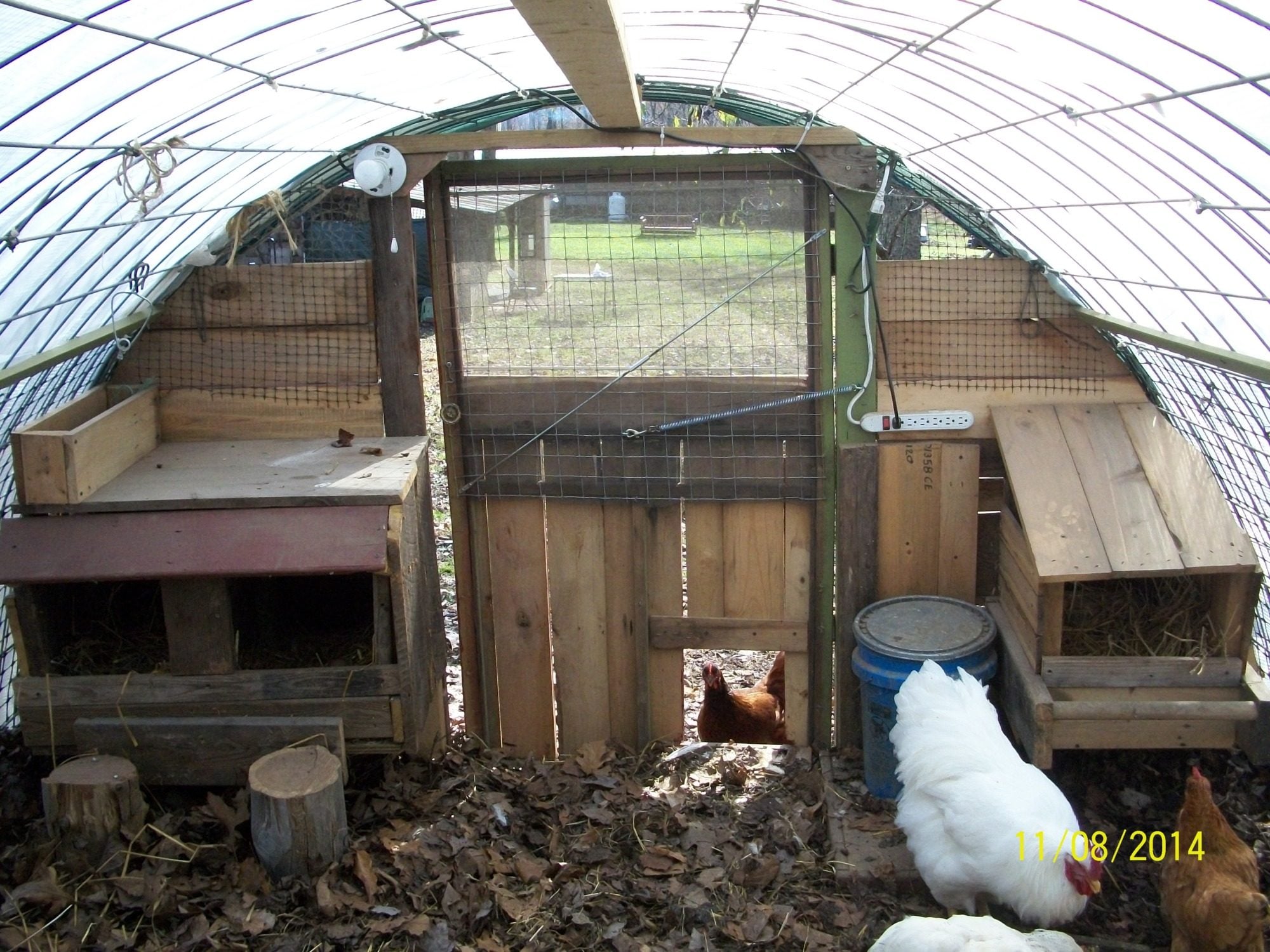I use a clear tarp on the hoops in the winter to let in more light and warmth and it has changed the whole nature of the coop since I switched to that. It's bright, warm and cheery even on the darkest winter day.