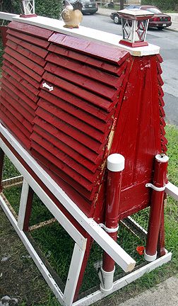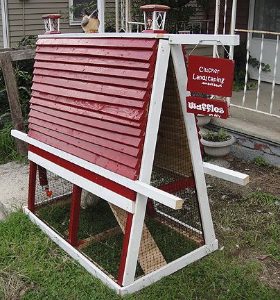 My ultra-tiny tractor. Just one hennie in here. We have a TINY front yard, and it's all WEEDS, so we're letting her rip the crap out of one section at a time, moving her, then seeding behind her. Clucker Landscaping! (1-800-BUK-BAWK) Waffles On Duty. The lamps on top do light.