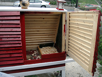 See the boards screwed on the left side of the coop, under the windows? The hole is cut for the nesting boxes but the ladies are only 5 weeks, so to keep them out of them, we decided to build them separately and wait until close to POL to put them on. As will be with the other coops also. There are sooo many screws in those boards, nothing on this earth, will be able to get in, well maybe a bear could, but they don't come up near the buildings nor mess with them!!!