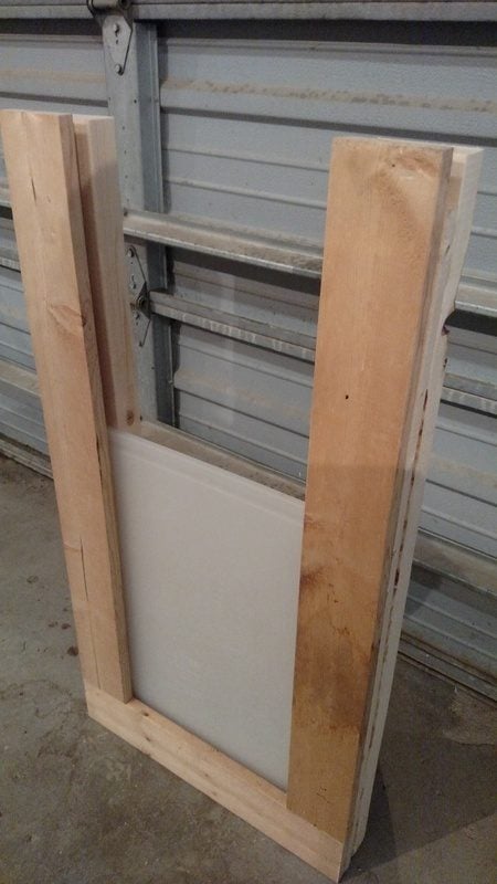 Built and installed the pop door today. Here is the door assembly (yes, that's a cutting board) :