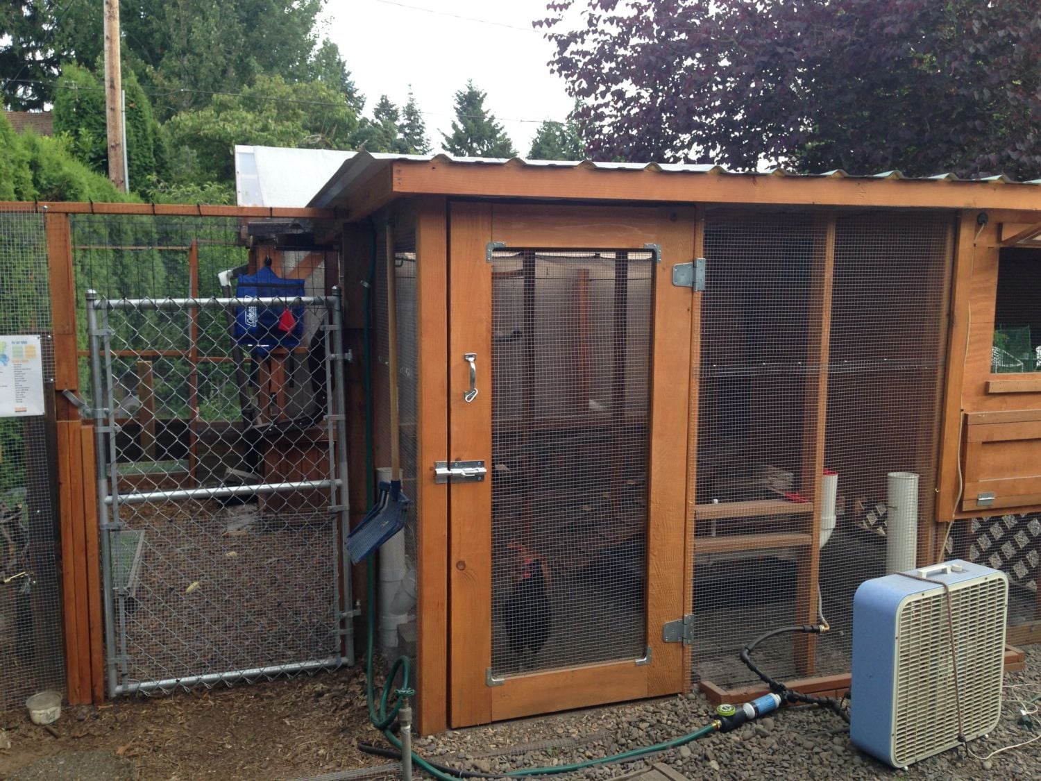Very nice! What's the fan for outside the coop?Here's my coop/run. The footprint is 6x10; the run has a 2 foot apron. Every opening is covered with 1/2 inch mesh pneumatic stapled on. The primary run is covered with roofing. There is a secondary run walled in by the chain link fence in the back, and the green house, coop, and fill in fencing/gate. So that makes a total footprint of 180 sq feet. The secondary area is covered with netting and only used in the day. There is an Ador1 automatic door between the primary coop/run and the secondary run. Thanks for looking! View of coop/run part of secondary run and then the greenhouse visible on the right.Side of primary coop/run with gate to secondary run on left.