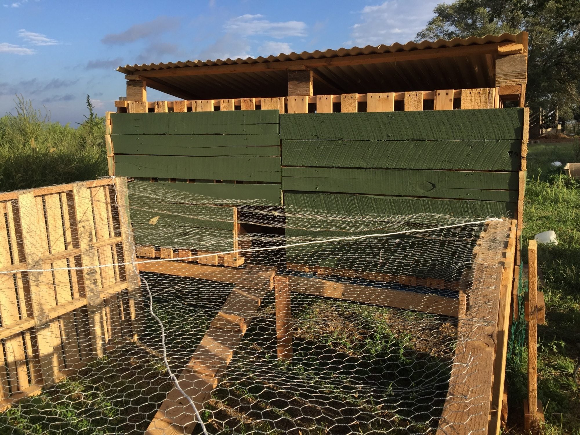 Wiring is THE MOST expensive part of building a pen and if you want to keep your poultry safe and not torn apart by predators use 1/2" hardwire. You never knew you had raccoons, possums, bobcats, foxes, feral cats/dogs, skunks etc until you start keeping poultry. Dogs and foxes will dig under the pallet fencing and 'coons/possums will just reach in at the weakest point of poultry wire and peel it back easily. I hate raccoons the most because much like dogs they just like to chase, maim, or tear apart chickens just for the thrill and not necessarily for food. 'Coons can easily climb stucco, brick, block walls, rain gutters, chainlink, wood, etc to get to poultry - some cleverly find access through the smallest openings because of a collapsing spine so any open venting should be securely covered and stapled down with 1/2" wire. Yep, not cheap to have organic eggs - guess that's why chickeneering is called a "hobby" and not a "profit" business.