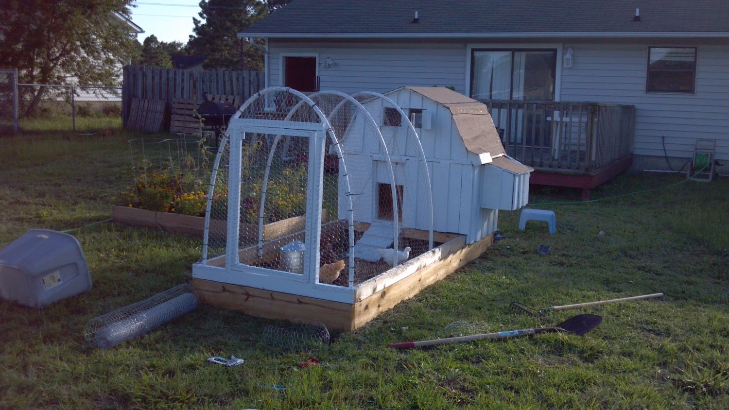 In my experience I would not use chainlink fencing,what I use is the chainlink dog kennel panels 10x10x6,that way you can just add more panels to enlarge when needed,then we took goat fencing and covered the top of kennel,last longer,then we take ckn wire n run along inside bottom f for extra safety n security.wish u best of luck!I am trying to figure out what to do for a chicken run with my new coop. I was thinking of buying a dog run and putting the coop in that and adding a roof to the run. But after measuring my coop I think it would take up most of the run. So I was thinking having the coop on the outside, with a door into the run, still adding a roof on the run. It seams kind of complicated though. It is a chain link dog run. Will chain link keep coons, skunks, and foxes out? Or can they chew through that too? Here is a link to Home Depot for the run I was thinking of. If you look at the reviews there is someone who turned it into a chicken run (with a picture). I guess my questions would be, how do I cut a whole in the chain link so I can have a place for a door to the chicken coop, and how do I attach the chain link to the coop so predators don't squeeze through? http://www.homedepot.com/p/K-9-Kwik...-x-6-ft-Kennel-308594A/100322469#.UhDkQJJJMzA As a reminder, this is my coop (before I fix it up)![]()