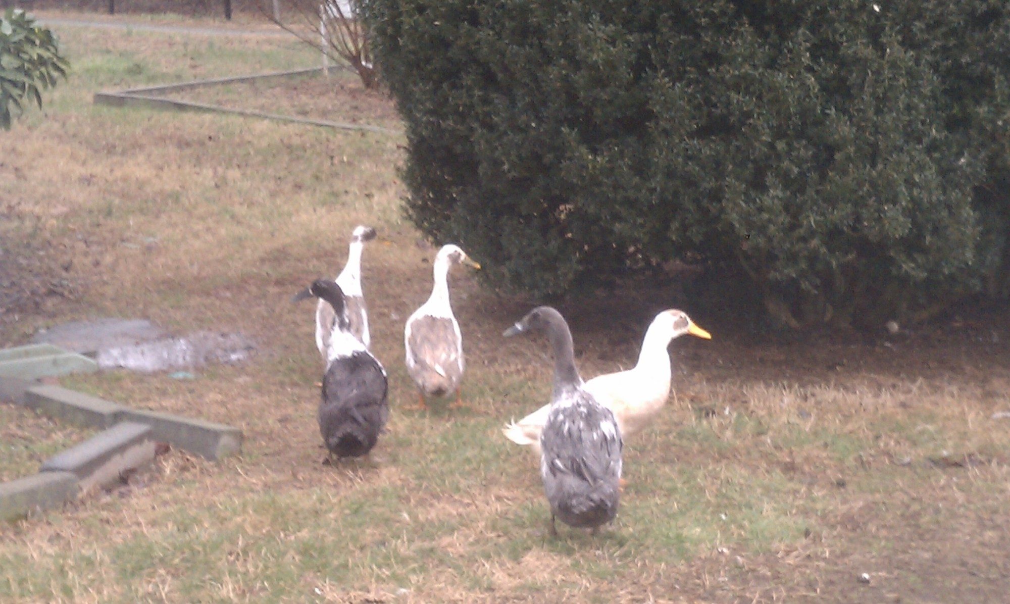 The drake is the fawn and white on the right, his name is Ferdinand, the mostly all grey is Cocoa, the black and white is Oreo, and the grey and white with more grey on her face is Cheeky...the grey and white in the middle doesn't have a name, and I'm stumped as to what to name her...