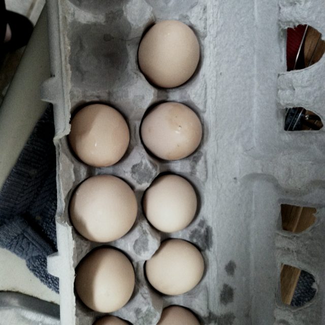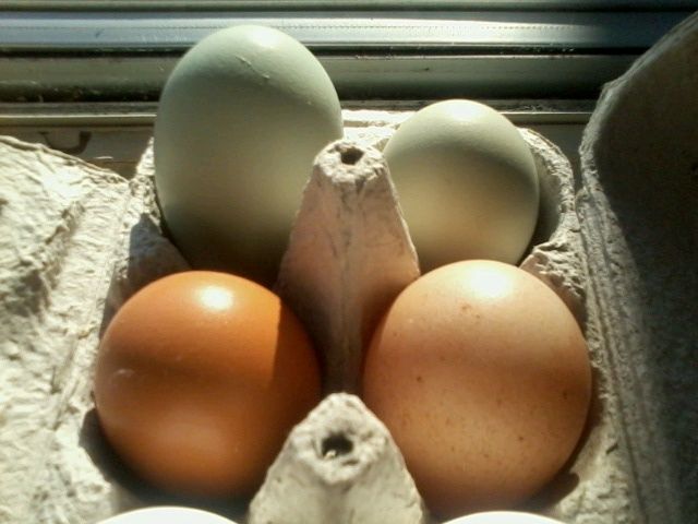My girls' first efforts. Not sure who is laying what at this point, other than the gorgeous blue-green eggs. Here's who's in the coop: Golden Sexlink Giant Barred Cochin Sicilian Buttercup Partridge Penedesenca 2 Ameraucanas Who do you think laid those brownish ones? They all hatched out between March 8-20.