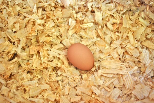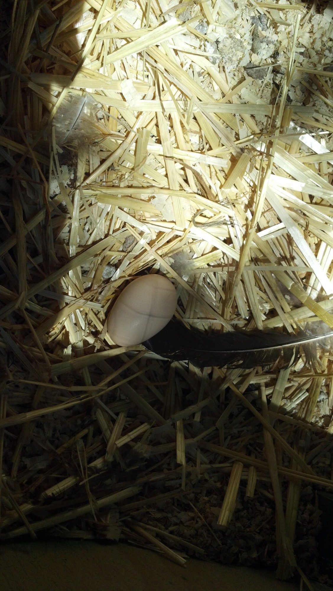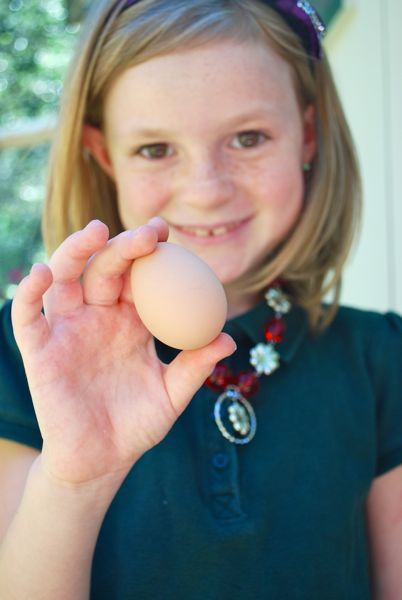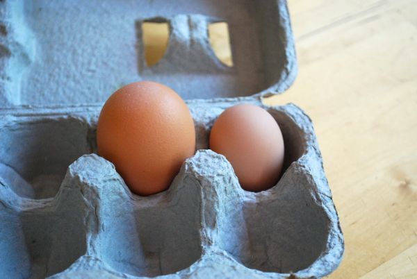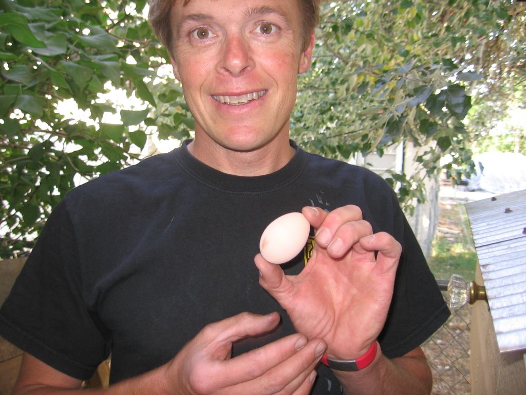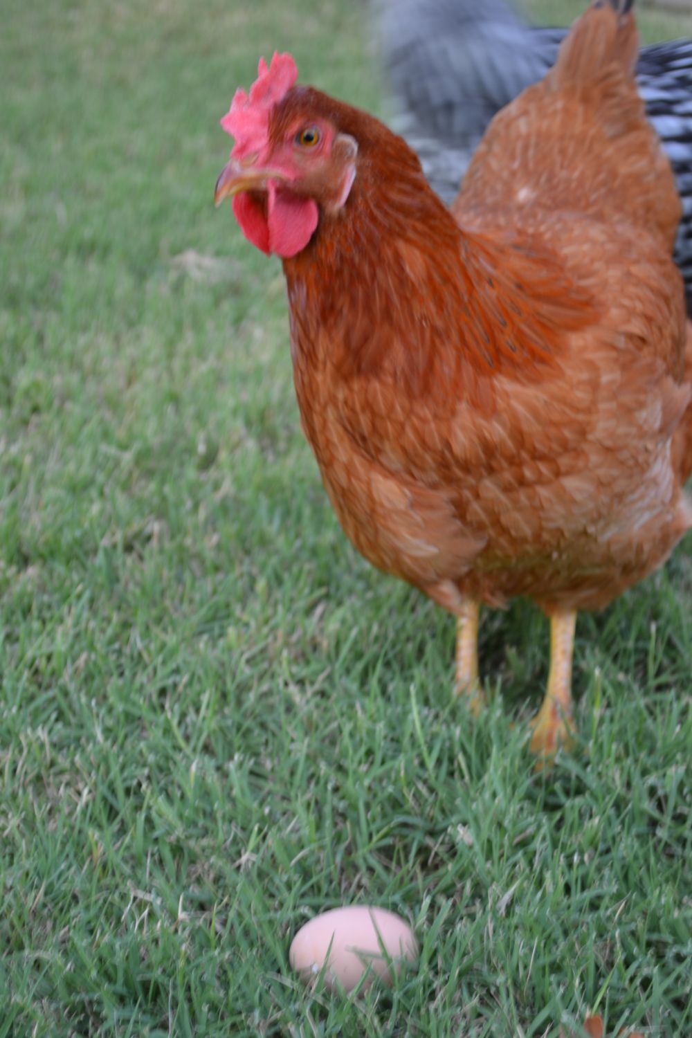We're so excited! We just got our first eggs today -- one from the Rhode Island Red and the other from the Silver-Laced Wyandotte! We don't know which egg is which (any guesses)? One was in the run (next to the waterer) and the other was tucked up in a nesting box. Both hens are 22 weeks old. We knew they were getting close because over the last week or two they both got larger combs and wattles that turned very red. They've also started squatting a bit and bawking. Our third hen, a speckled sussex, hasn't really shown that change yet, so we're sure it's not her.