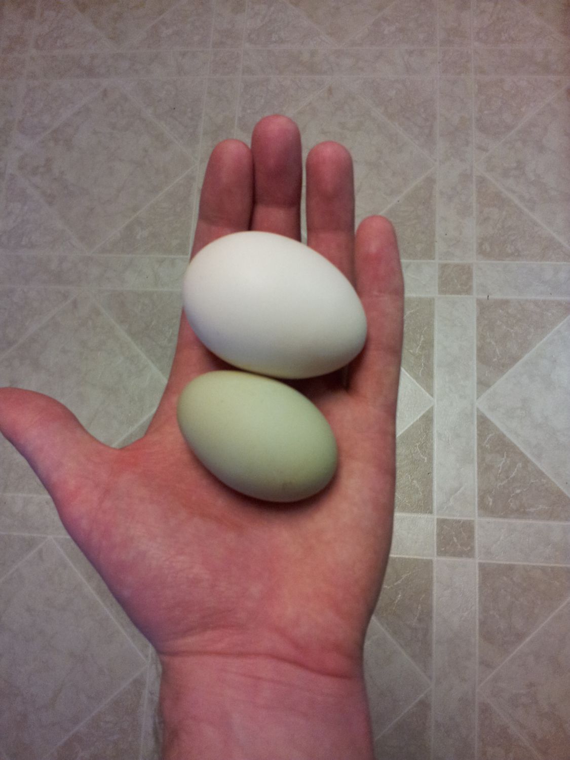 Well at about 21 weeks old we got our first Green egg! I had been eagerly awaiting these chickens to start laying and expected both of our Brown Leghorns to lay their first eggs before them. How pretty! Back left brown egg is our 2nd or 3rd egg from our young Red Star, those chickens never cease to amaze me. She started laying at about 20 weeks, our first Red Star started laying somewhere around 18 weeks or a bit before that and layed 89 out of her first 90 days of laying (she skipped day 2 only).Here is a picture of the green egg next to an egg similar to grocery store eggs(from our Blue Andalusian hen):