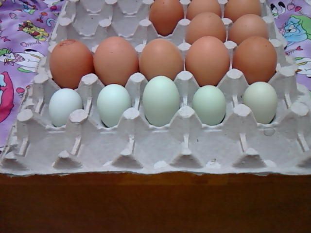 The minty green ones are the new eggs in sequence right to left. Middle is double size. Laying for about a week. Comparing to the red sex linked three or one year olds in the back. The greens are from my one americauna. She is one of the eight new chicks I am raising this year. 19 weeks she started. The others are rare breeds and will be laying shortly. I got a partridge wellsummer and cuckoo moran for chocolate eggs but the cuckoo turned out to be a roo. My older Cuckoo roo and the new one have interesting chases when Cookie the new one interferes with any chicken new or old. I like that about him.
