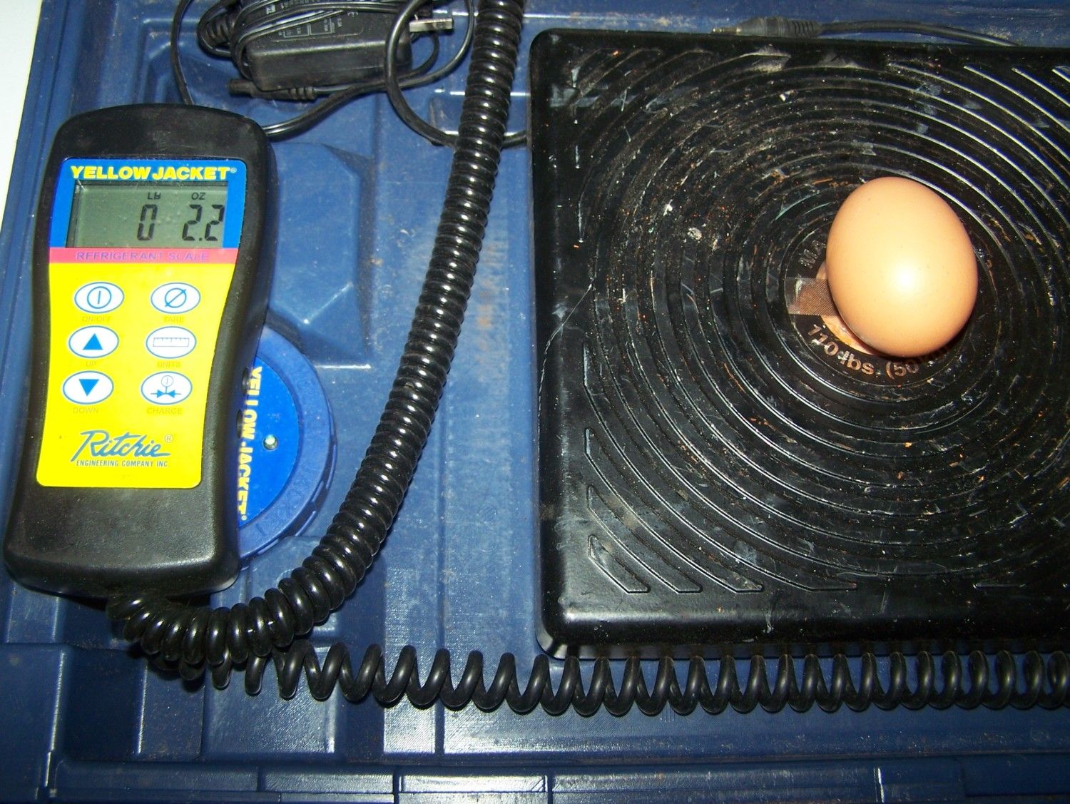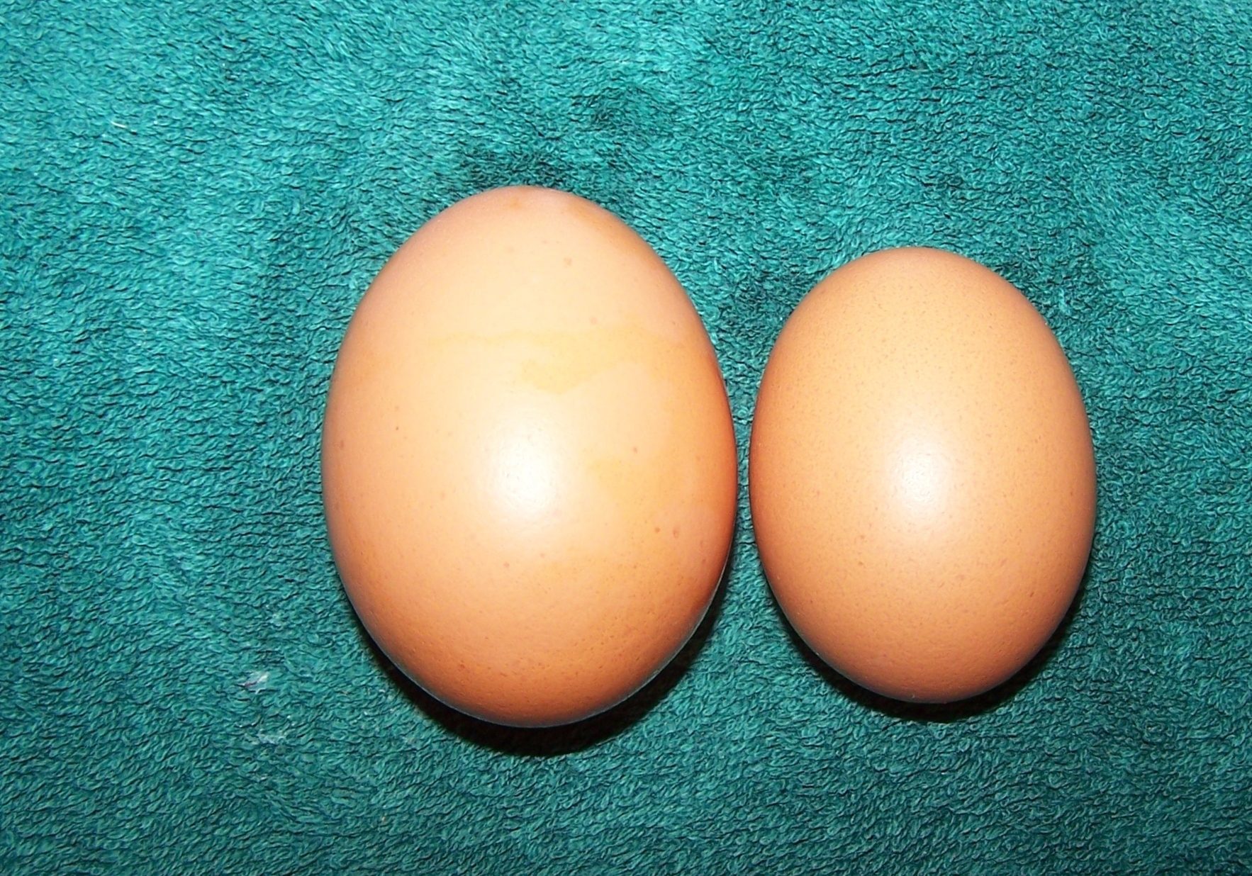 tell your girls good job!All but one of my girls is laying (I think) because every other day I get 7 eggs and I have 8 girls. The eggs are on the small side for the most part...but they just started laying a few weeks ago. Then I went out to the coop yesterday to collect any eggs. And I found this whopper! I swear a DUCK snuck into the coop...the thing was huge! Wouldn't even fit in the egg carton properly it was so big! Here it is beside a normal egg I get from my girls.I weighed the sucker...the biggest egg I've gotten so far was 1.6 oz. I used hubby's digital scale he uses for his HVAC job. This egg weighed 2.2 oz!