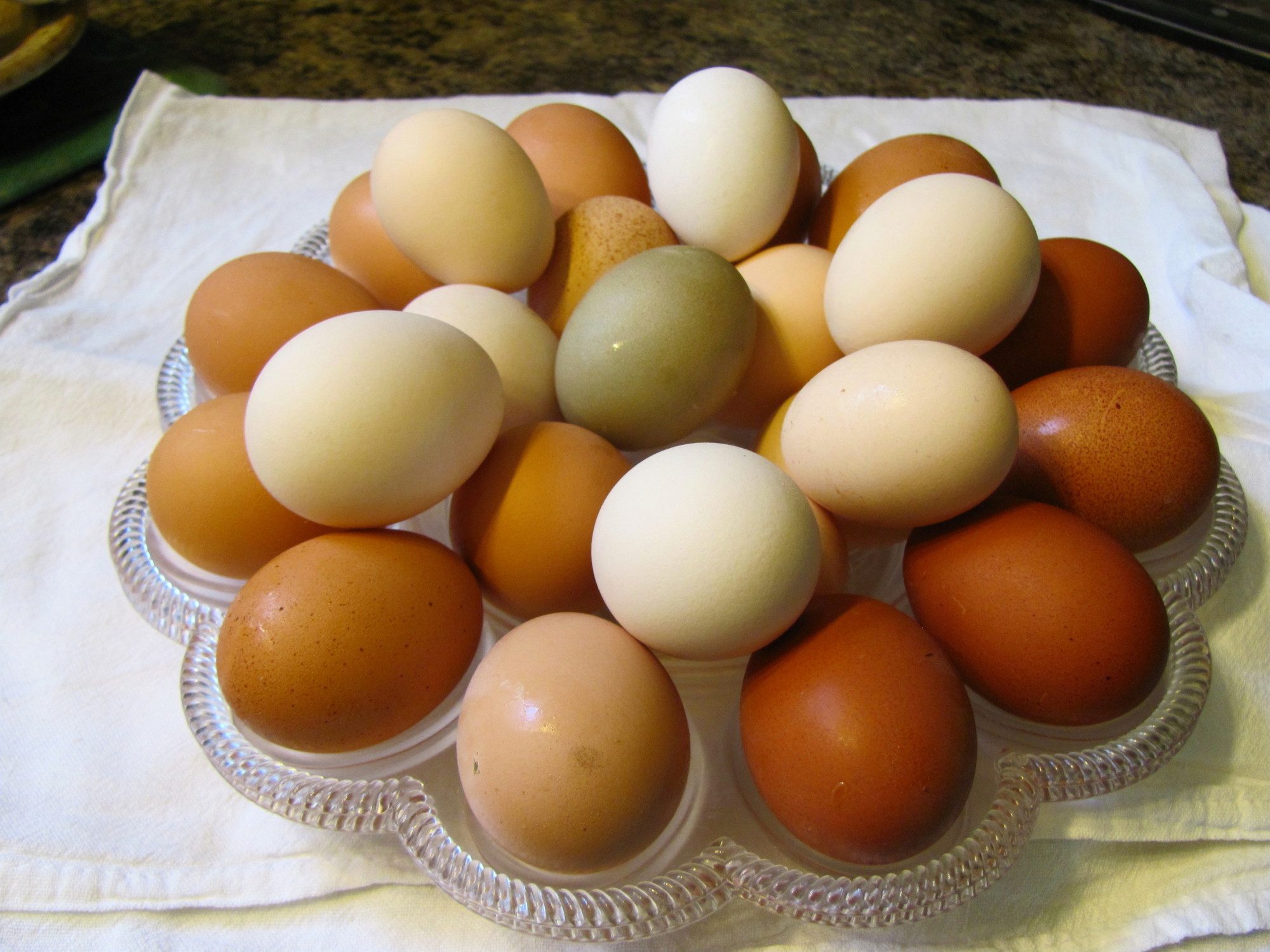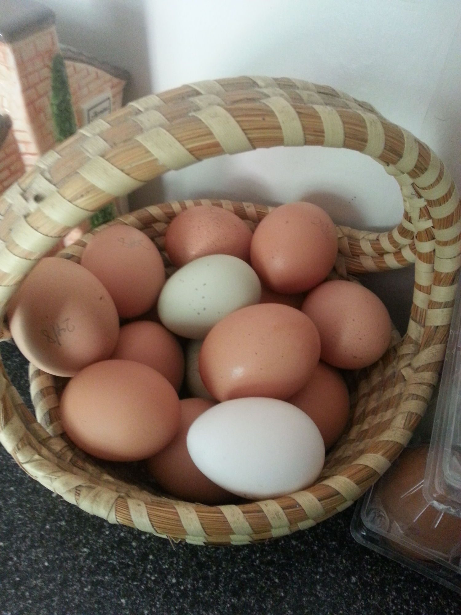 Our first chickens, our first eggs. Now have to check out that malformed egg...
