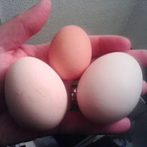 First eggs from my BR's, laid over the past 45 hours. One on the left is a soft shell, "ooppss" from the roost, laid last night and found this morning, frozen solid to the poop board, ( took a putty knife to get it off the poop board ) so I broke it open and it was fertile! I haven't broken the other two open yet, as I am not sure if I am going to blow them out and keep them or eat them....hmmm decisions, decisions....LOL