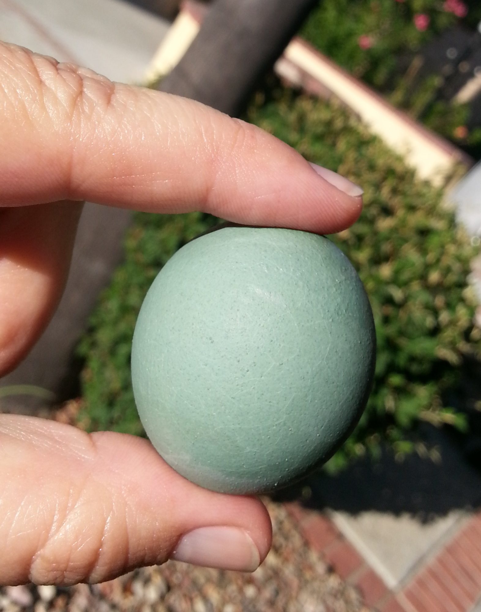 This was my least favorite chicken (doesn't even pretend to love me) until she laid her first egg! This was Cream Legbar daddy and unknown chocolate layer mommy (at least I'm pretty sure it was out of a brown egg). Next to Wheaten Ameraucana and Olive Egger eggs.