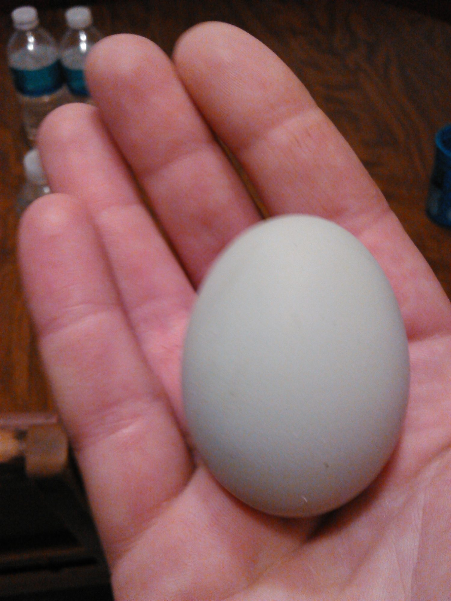 Congrats! What a pretty egg! I am impatiently waiting for our two EE to join the laying party so we can see what color they are going to produce!
