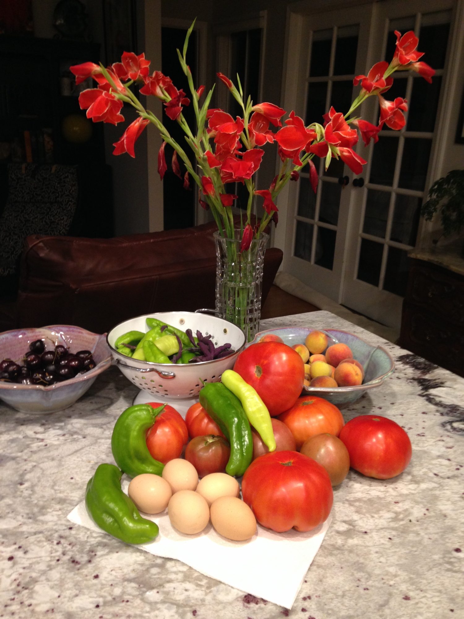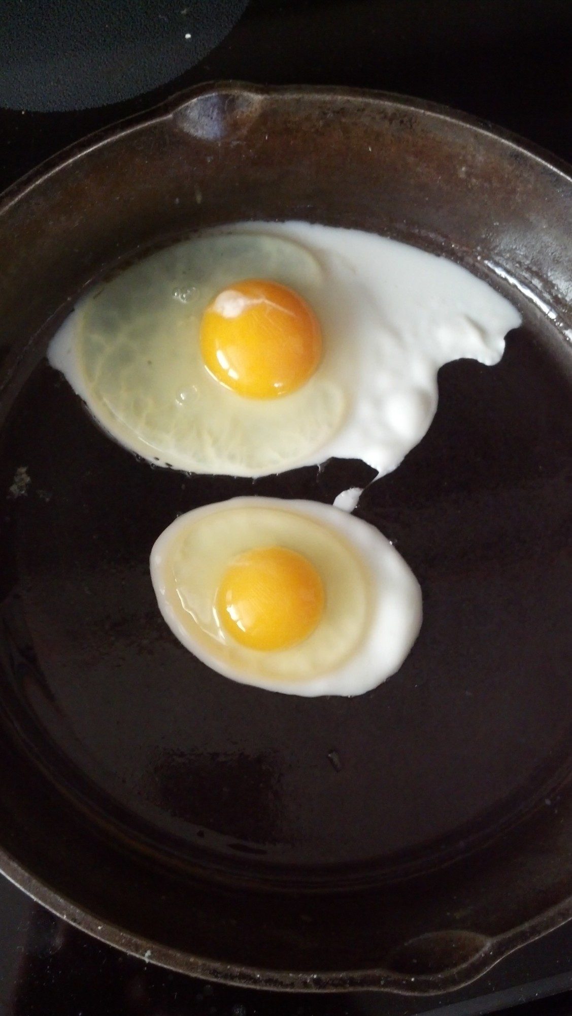 7 white eggs, regular or small size. 1 beige egg. I have 5 small white hens, 2 RIR, Production hens, I think. 2 dominecker hens. 2 large white hens, really large! I think the beige egg came from one of those. Thought they were binding so I rubbed some oil on their vents and then chased one of them off the nest where the beige egg laid.