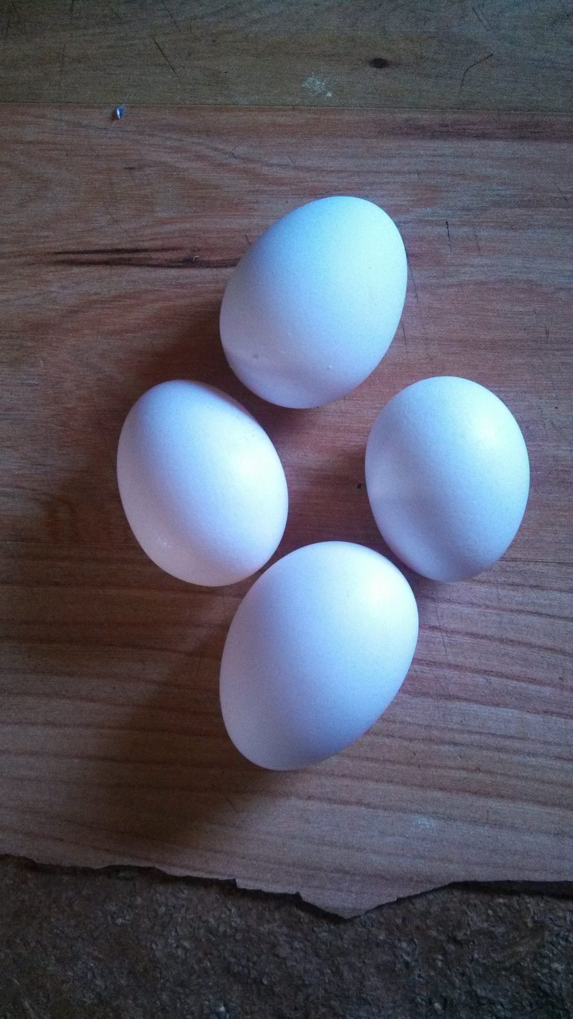 Our first egg appeared this morning!!! The RIRs are 22 weeks old but I think one of the 2 Black Beauties laid this one, they are 25 weeks old I think...
