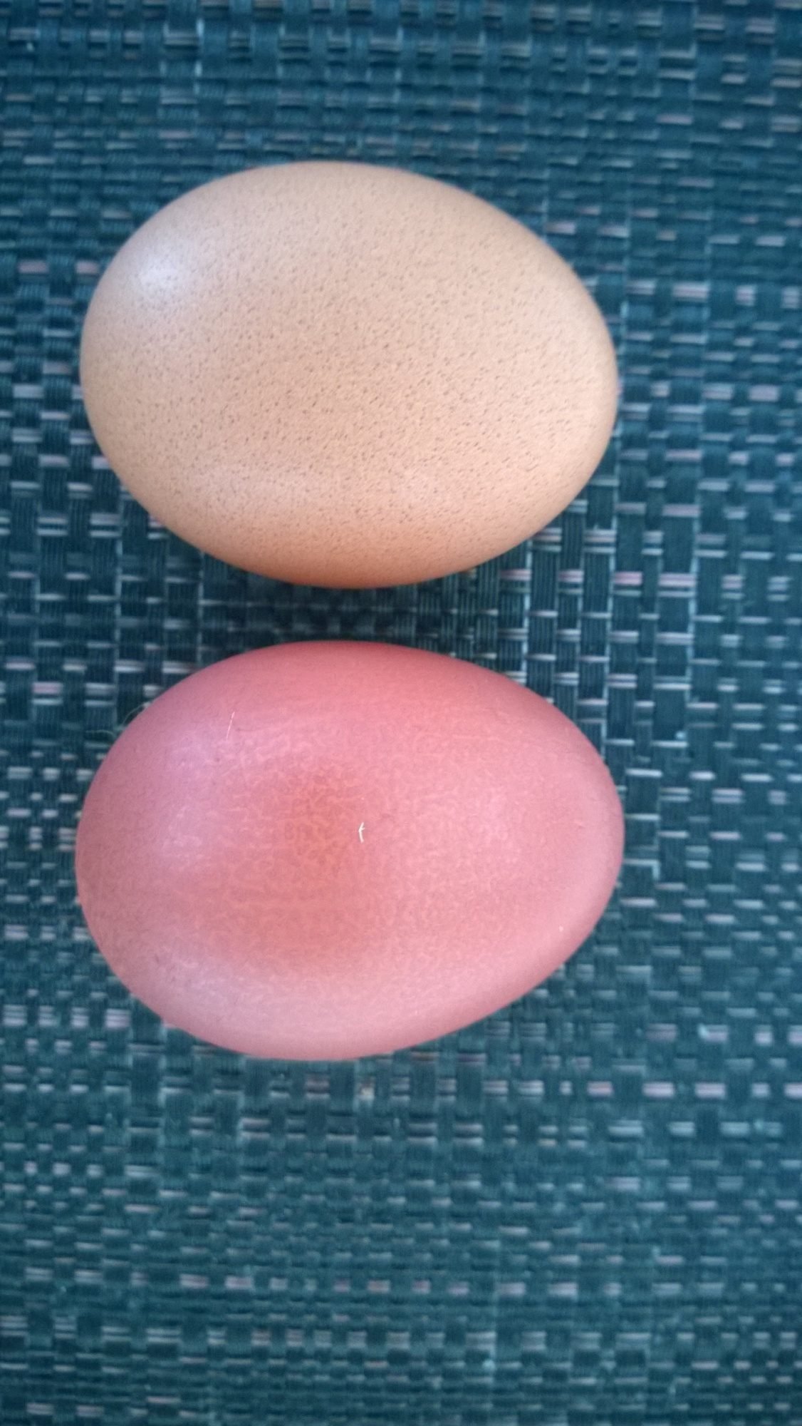 What's wrong with this picture? Oh, I'm not posting one. One of my cuckoo marans, Daisy, laid her first egg today! I never HEARD such a racket out there! LOL!!!However............I expected to see a dark brown egg! It was no darker than the barred rock's eggs, and about the same size (although the BR has been laying for 14 days now and were much smaller in the beginning). Our BO's eggs are darker! So I'm disappointed in the color, but I'm pleased with the size for a first egg. They should be really large in a few weeks, but I thought the cuckoo marans were supposed to be "chocolate eggers". Oh well, I'm sure they'll be great eggs anyway. Now, Pansy has to jump on the band wagon and start laying too!![]()