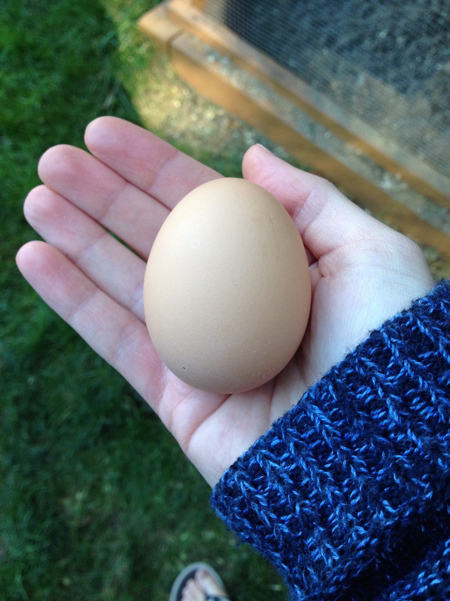 We got our first egg yesterday!! I think it's one of our buff orpingtons'. So cute and perfect I might blow it out and keep the shell ^_^ excuse my stupid foot btw