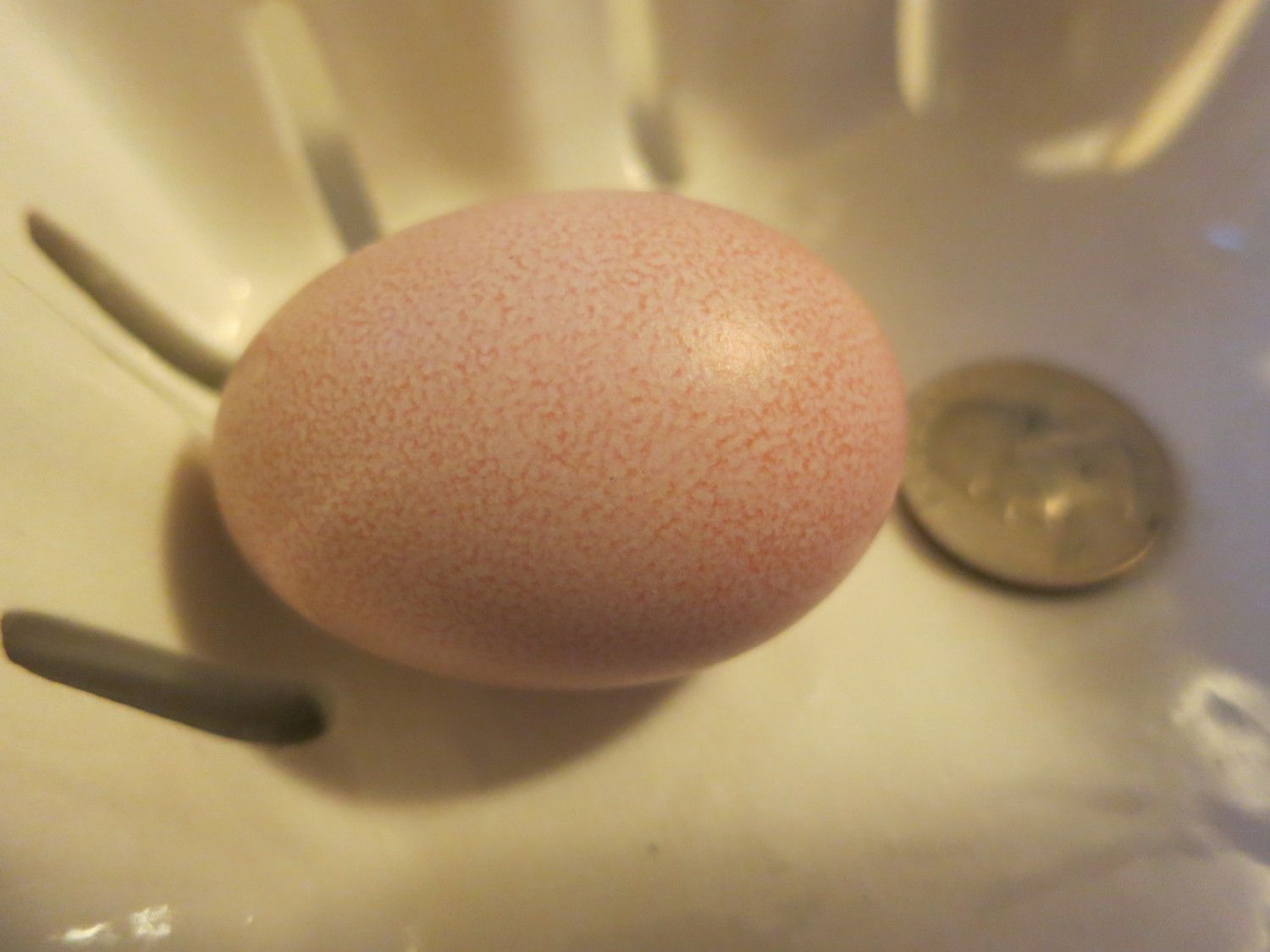 They have oyster shell available free choice and they have been eating it. They are still on the young side for point of lay, not quite 5 months old yet. I think it's just because things aren't really coordinated enough yet. At least they managed a yolk, whites, and a very thin shell; it's a pretty decent first attempt, in my opinion.