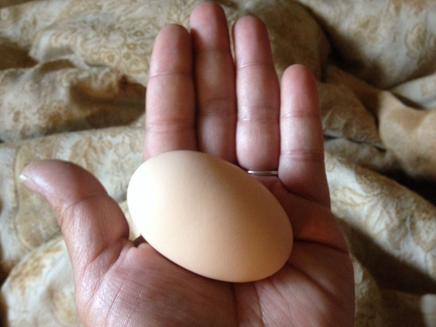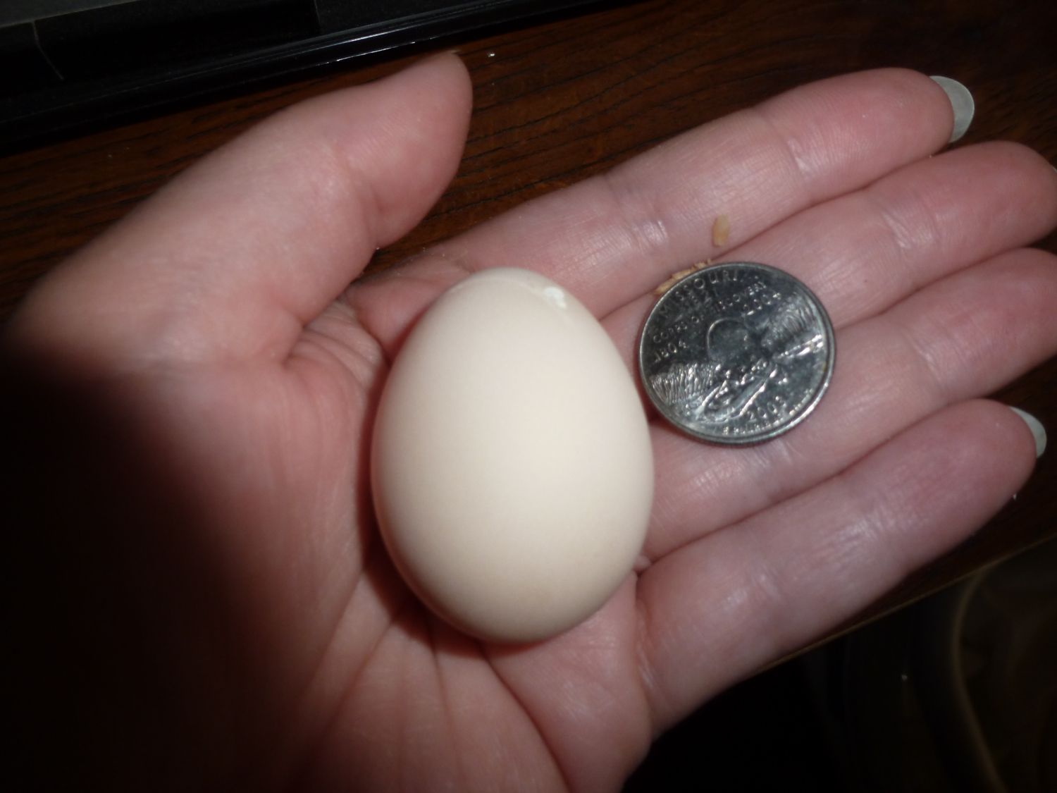 Bandi (silver duckwing OEB) and her first egg! She is about 18 weeks old.