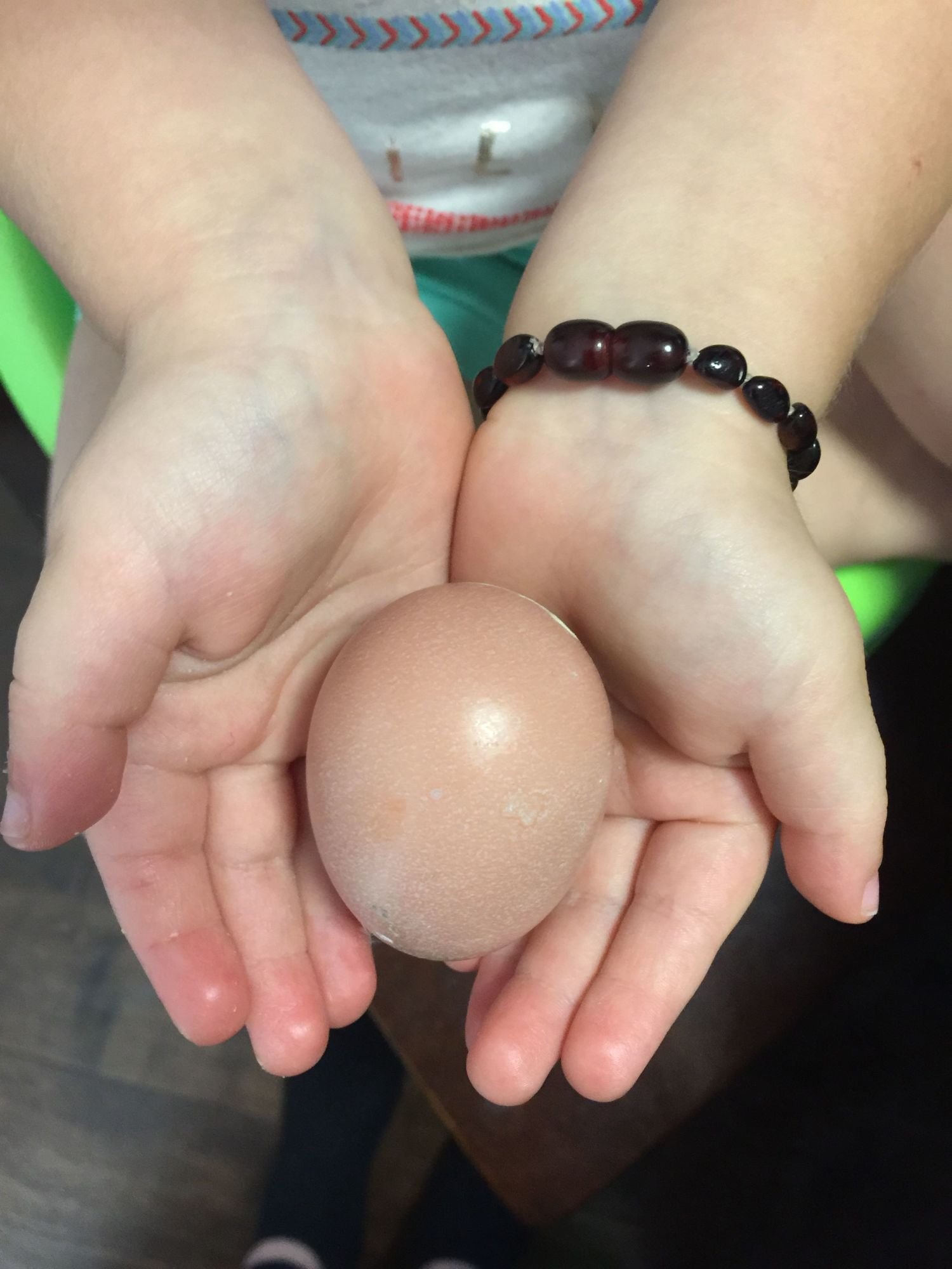 our first egg! we have 4 golden comets that we got may 13th and one of them laid her first egg on september 20th! she laid another the next day but didn't today...she took a personal day ;) these hands are my daughter's, she's three and over the moon to have found an egg!