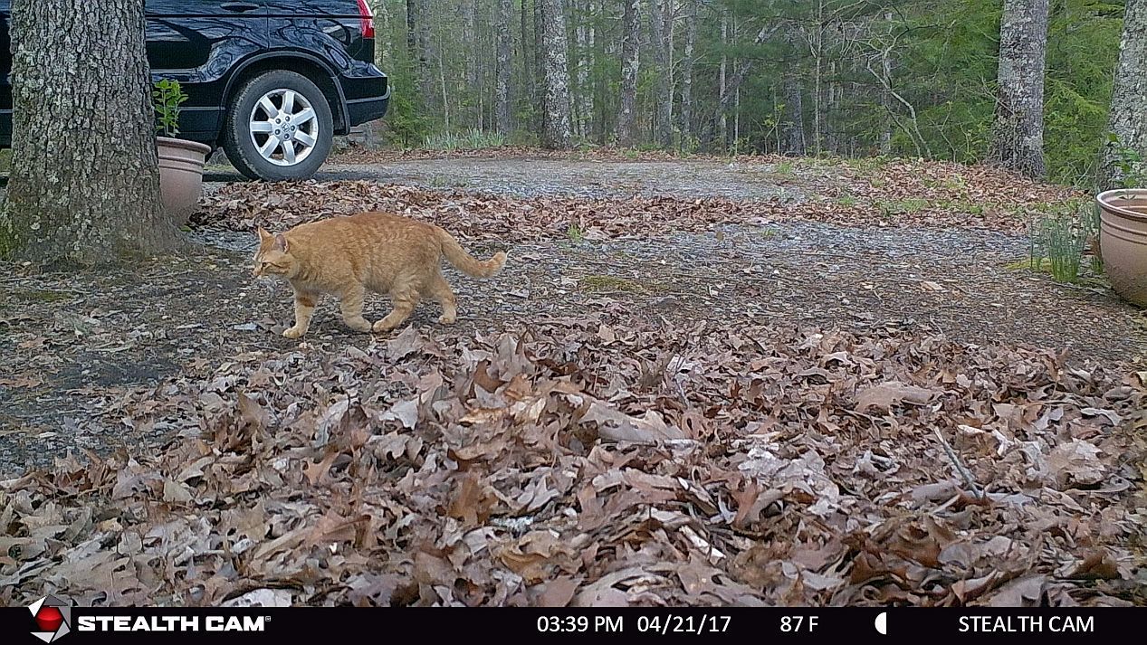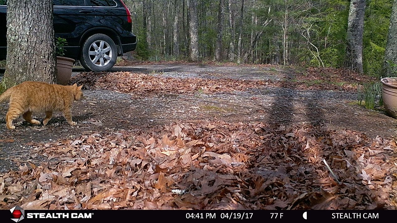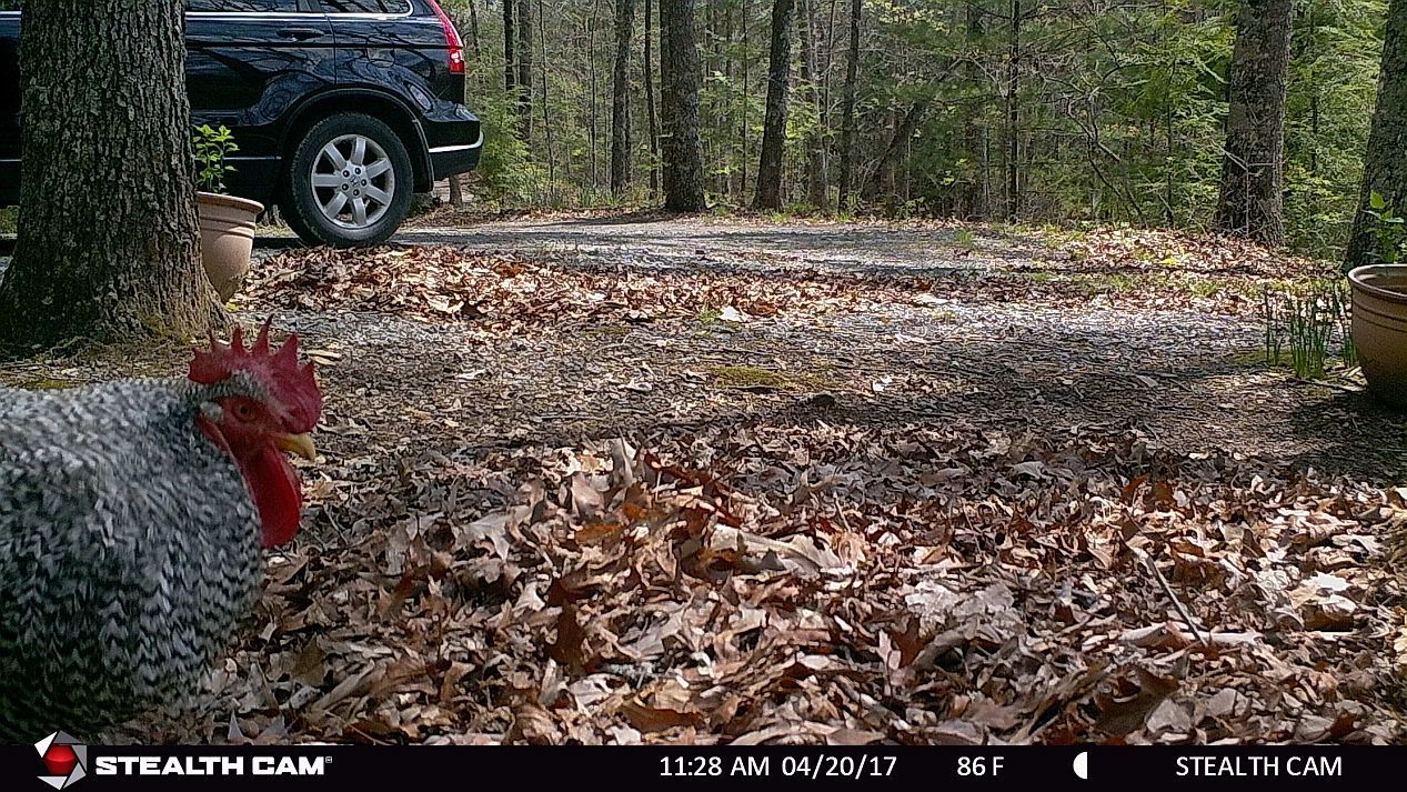 From two different game cameras. First the one that points to the driveway. Seems nothing really passed by over the past three days but my cat and my oldest rooster.