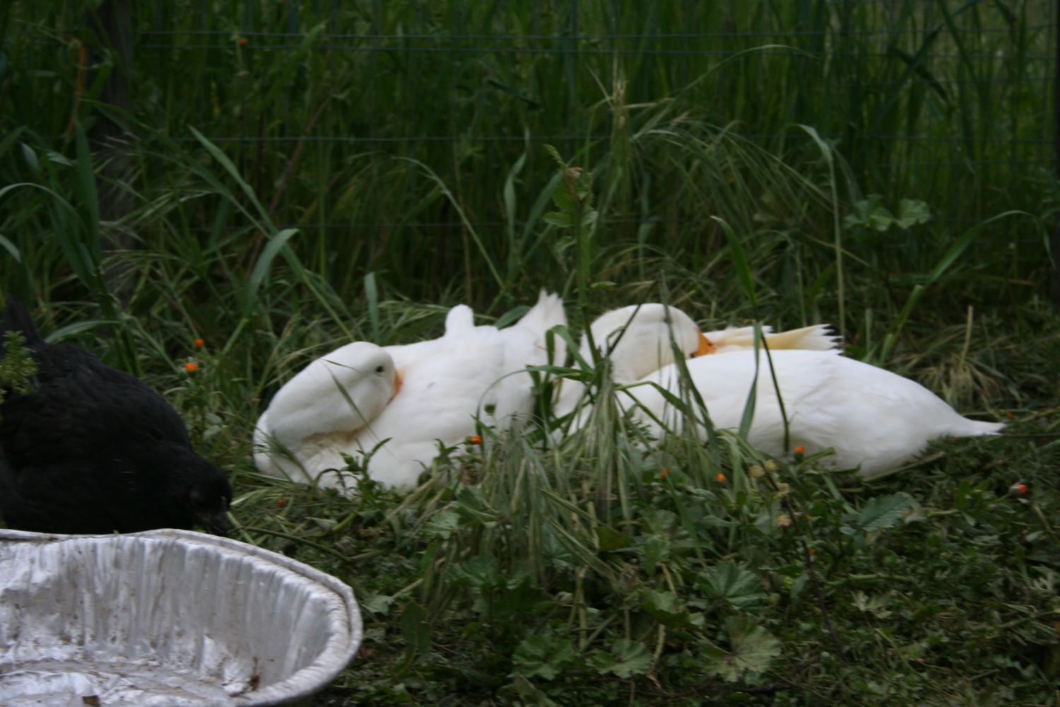 My daughter's Pekin "babies." Don't even ask how many ducks she has right now, because this isn't all of them. I think the duck weighs half of what he does. This is a young Jumbo.