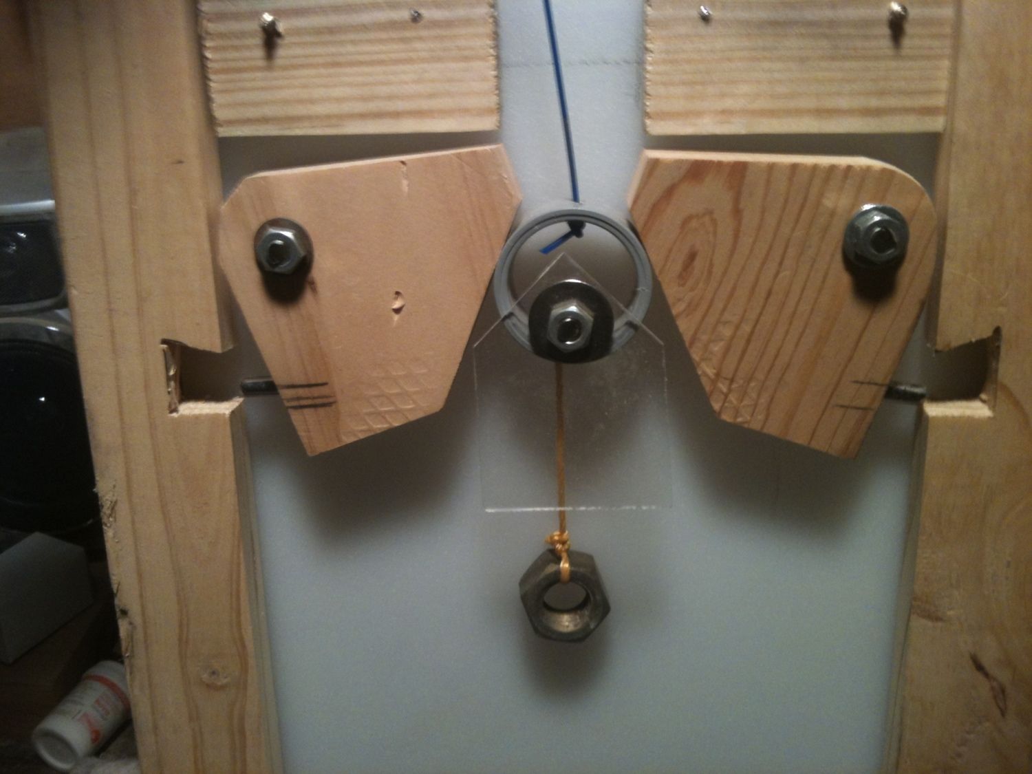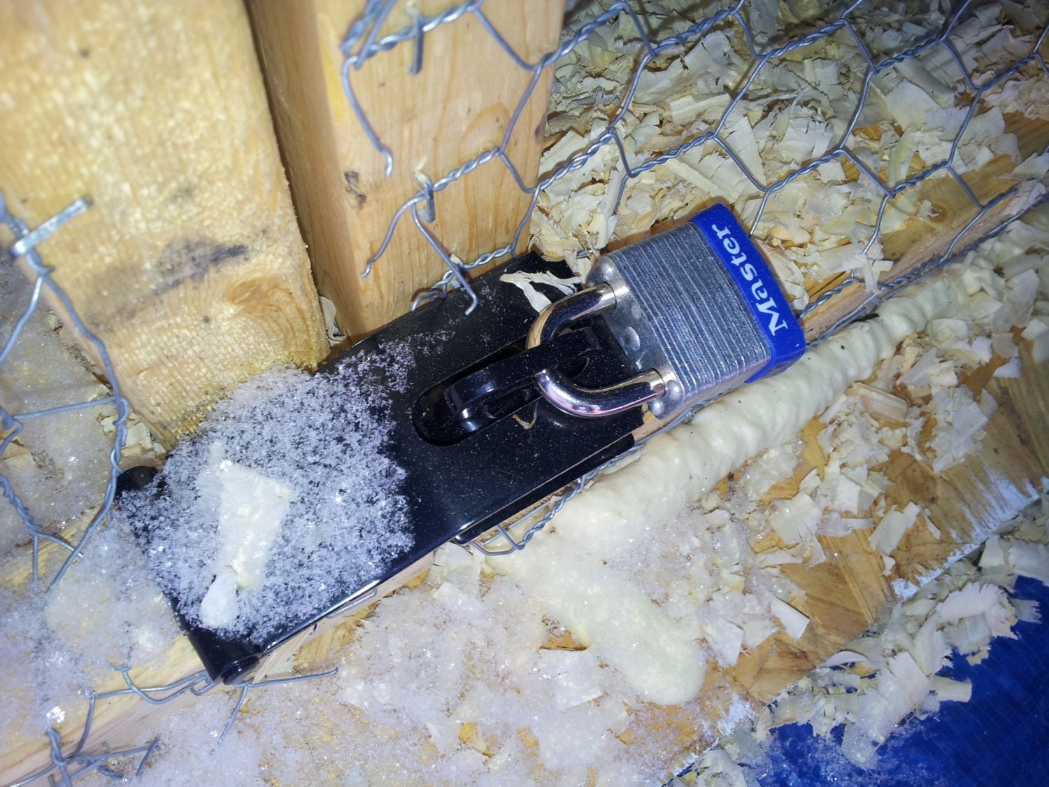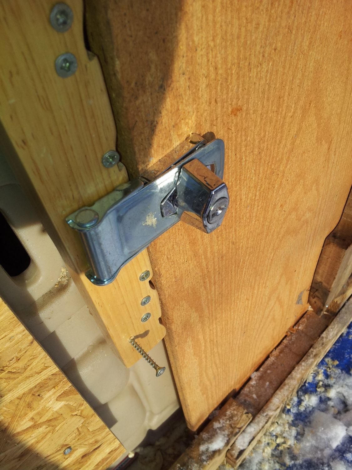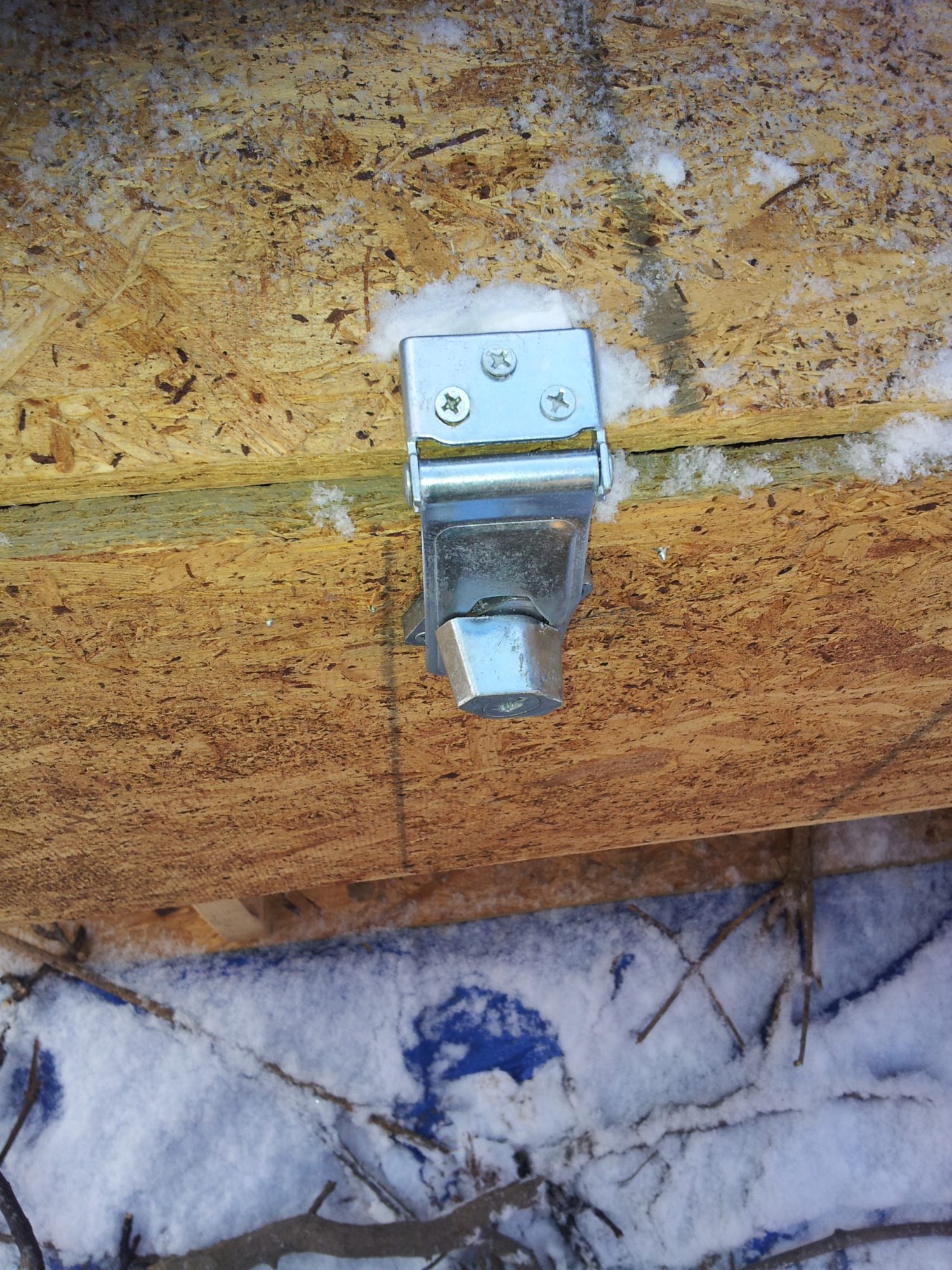 Pictures of my pop door, open and shut, and the cable that lifts it. I don't have a lock for it, but the 2 X 4 at the door frame allows the door to go lower than the opening so it would be extremely difficult to open it from the outside. I hope I explained that well enough. If not I can try to take additional pictures to illustrate.