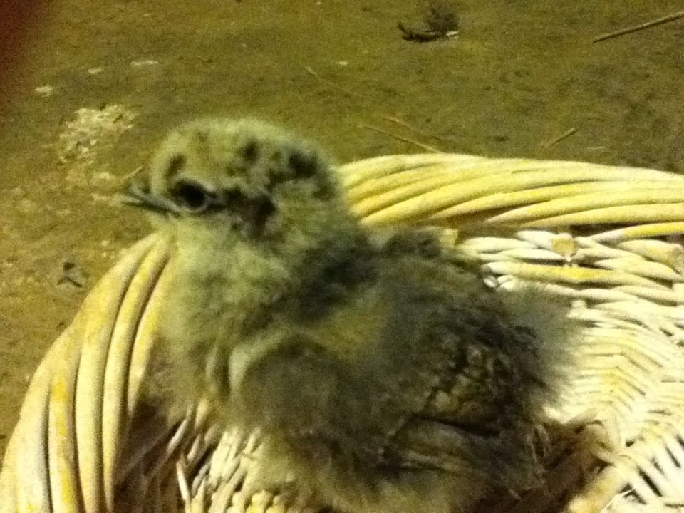 Frizzled Silkie chick - a few days old. Gender unknown. Colour is either blue or blue partridge. Hard to say when she isn't fully feathered.