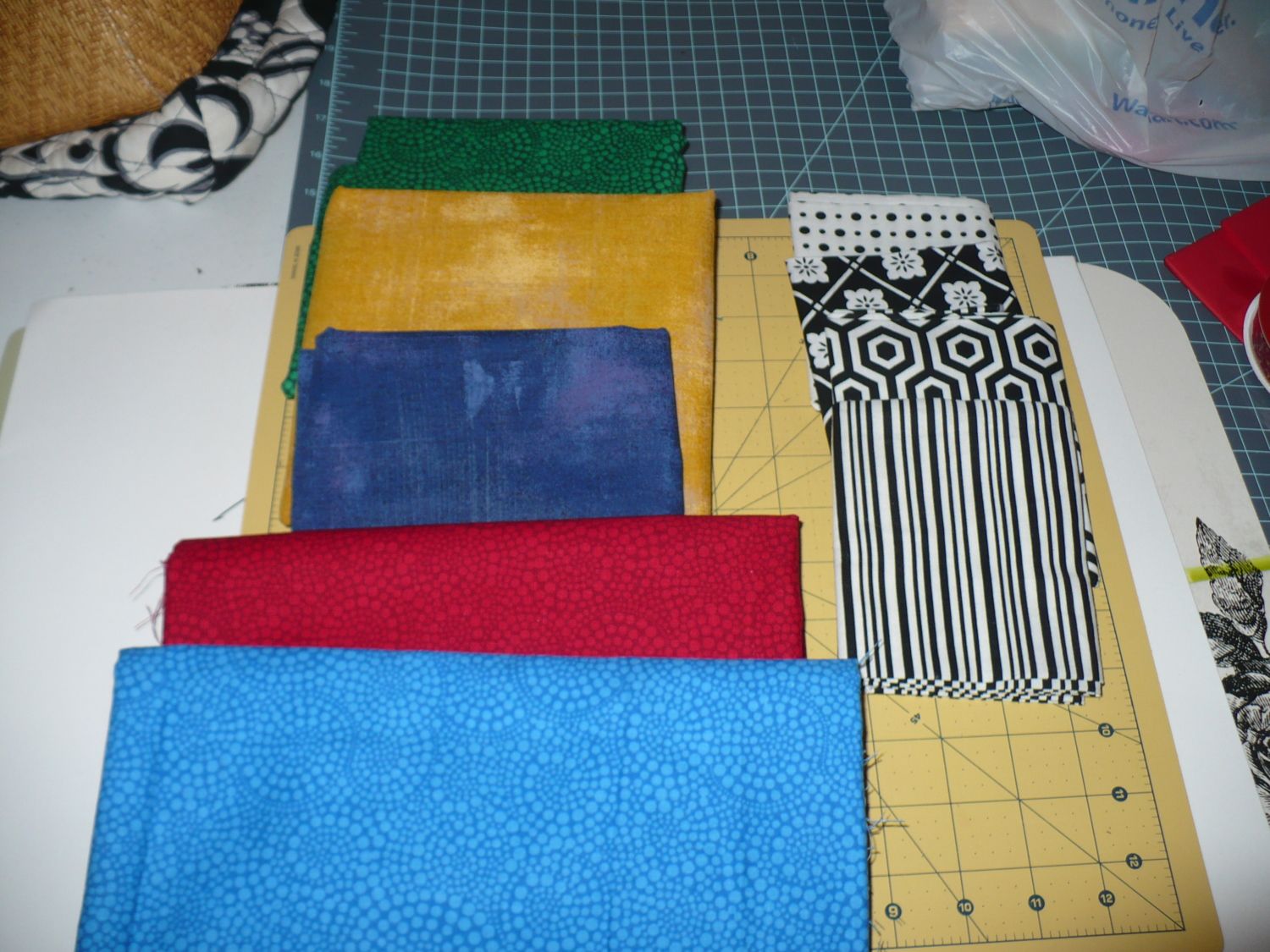 I need your advice/suggestions I have never worked with panels before, but I wanted to make one for my daughter-in-law, she loves Marilyn Monroe so I'm going to cut these apart and want them off set from each other, so here are my colors I will use, just picked up the black and white, not sure if they have a place, probably will not use them, but anyway, so how would you piece this one?