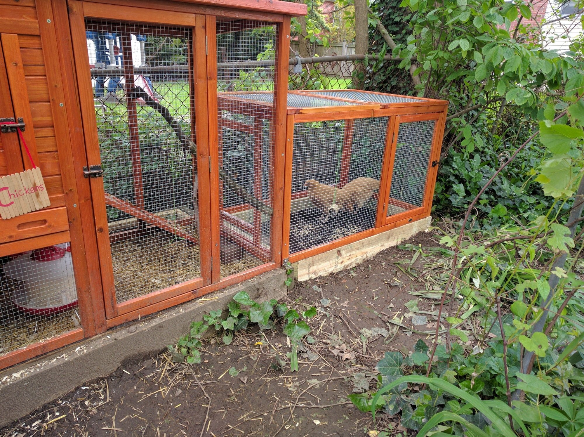 Spar Urethane (2 coats). I also prepared the site for the coop by making a matching bottom from 2x4 and 2x6 and stapling the hardware cloth on the bottom. So far (about 5 weeks into the ownership) I see no signs of any intruders (I see a rat from time to time in our neighborhood, but fortunately no foxes or raccoons).