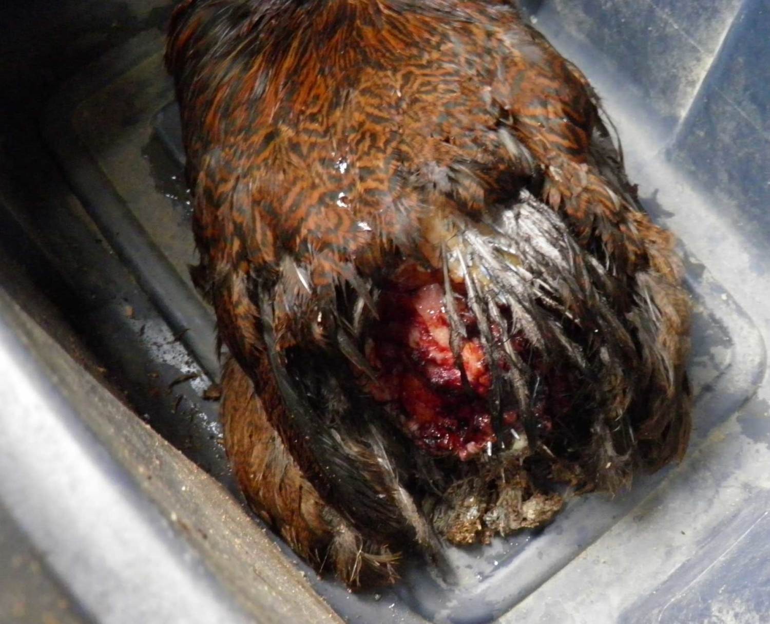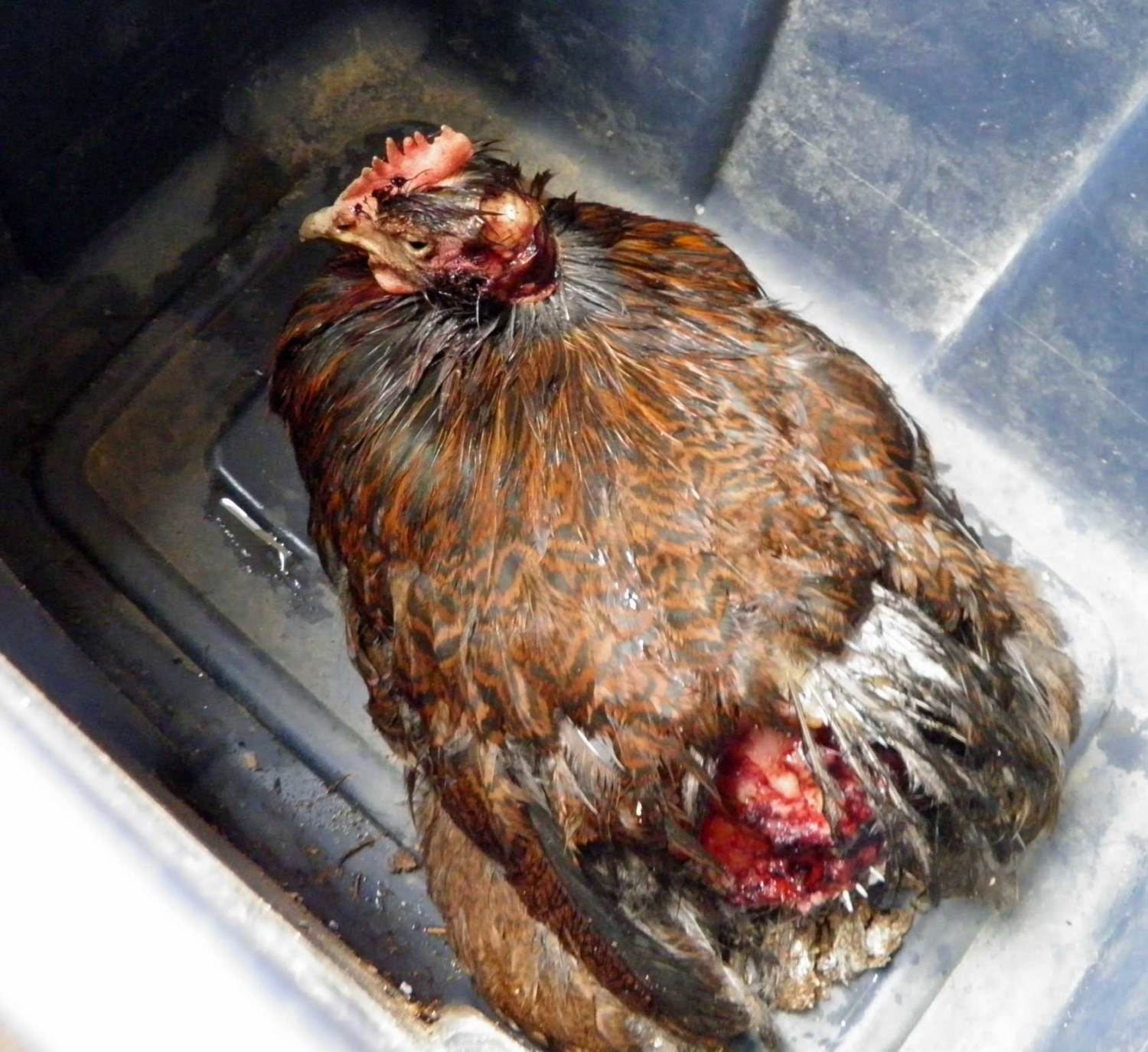 We have a 4yr old Plymouth Rock hen who accidentally was left out of the chicken house last night. My husband found feathers this morning & we assumed the predator had taken the body off. However, when he went to do some cleanup a while ago, she came crawling out from a hiding place - she somehow managed to escape.