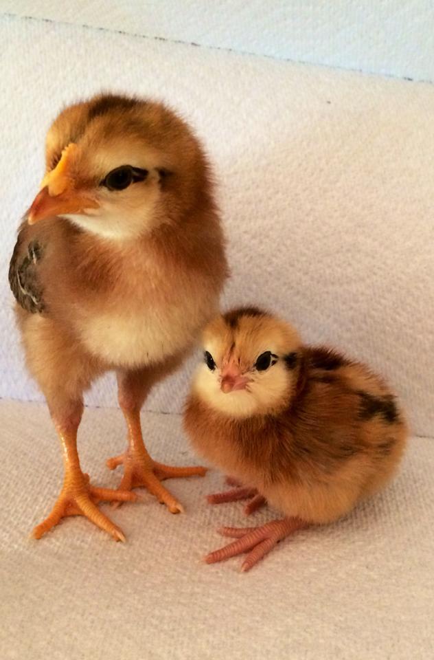 I do have my chicks already, and I got them all at the same time, so they are the same age. Also do you know what breed the chicks in the picture are? I have two like that (got my chicks from TSC) and they weren't sure what breed they were. I'm between either brown leghorn or speckled Sussex.What everyone has been saying about bedding and food sounds great. A good starter crumble with the chicks on pine shavings. I don't know if you have purchased your chicks yet or not, but I thought I could help illustrate how truly small day old chicks are. In the picture below there is a 1 week difference in age. These two ended up growing up together and did just fine. I even had a two month old pullet care for some foundling chicks my neighbor found after her lawn guy accidently startled the hen off the nest as they were hatching. (She was hiding under an old rundown mower, and refused to accept the chicks after all was said and done.) In both of those cases everything worked out because of the personality of the older birds. However, there are apparent risks involved. Can you imagine what one more week in age difference can do? Older birds can be more aggressive, day-old chicks are still a bit wobbly on their feet, and then there are disease issues. Trust me you do NOT want to risk an infection of any kind taking out your flock. Keep the chicks separate until the youngsters are older and you are 100% certain that there no disease risking the health of your birds.![]()