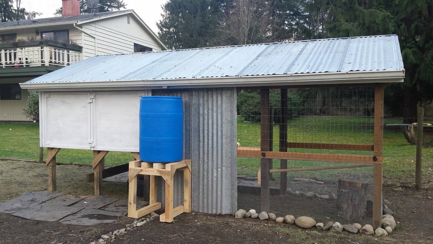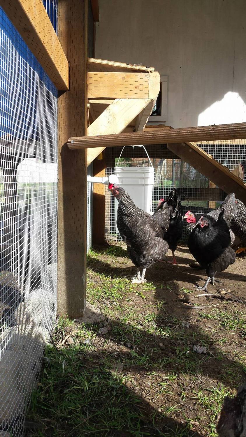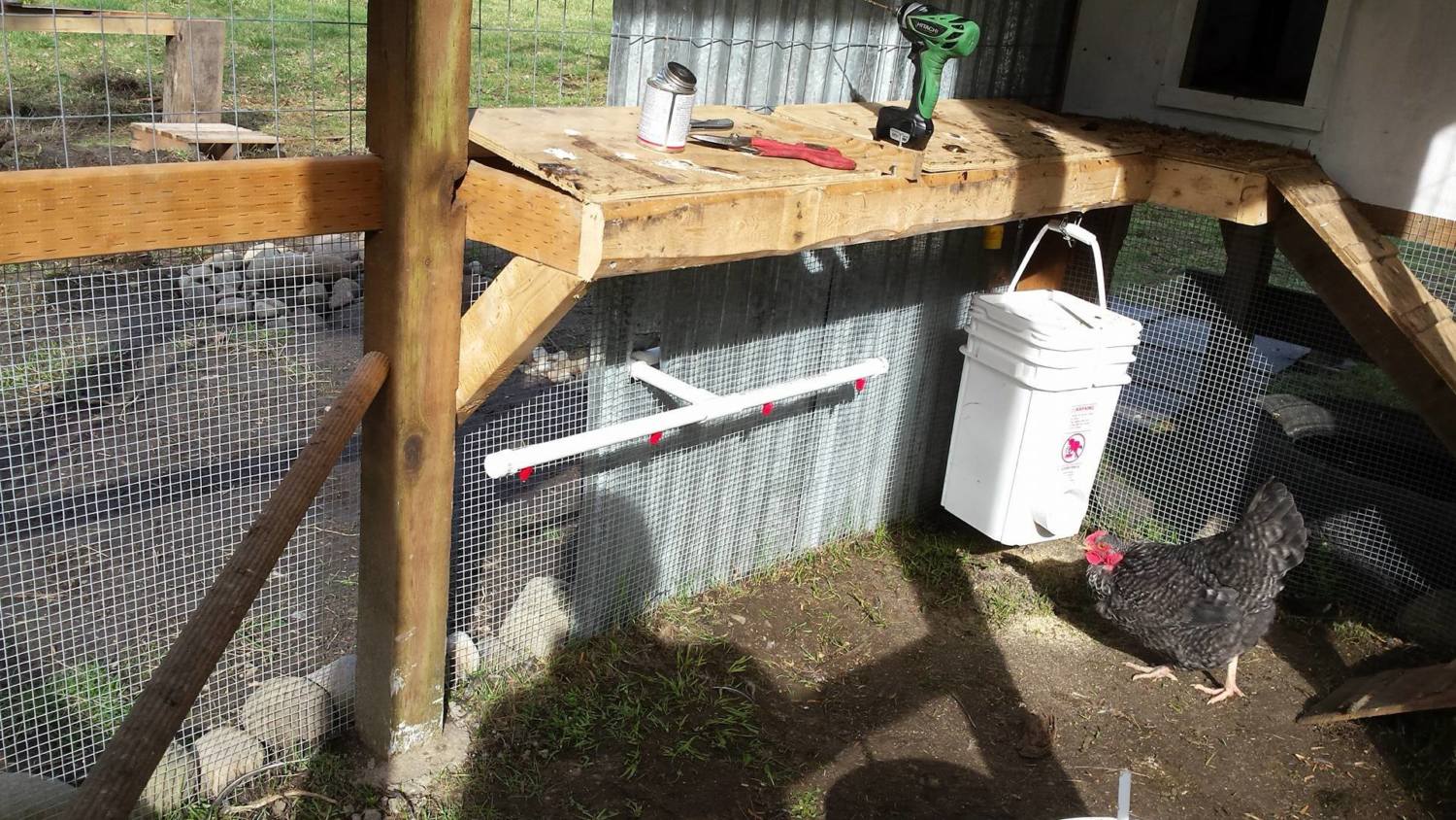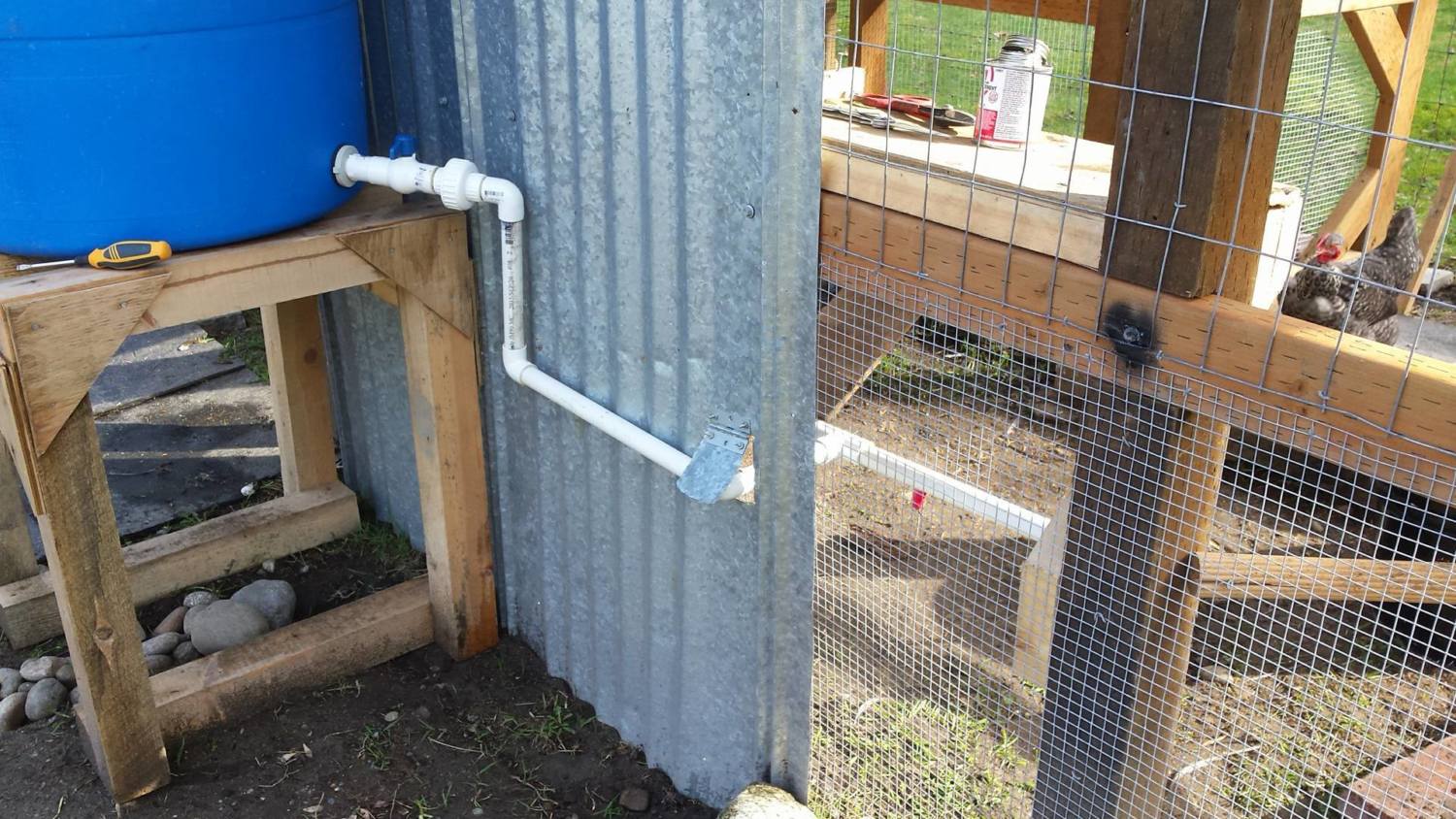 Hi there! Did you seal every joint with pvc glue? I have a similar setup and found that with horizontal nipples, it leaks like crazy. It never did before when I had a five gallon bucket feeding it and used vertical nipples. Im going to go back to vertical nipples but have been afraid the 55 gallon feed would still leak.I have to use a 5 gallon bucket wrapped in heat tape for the winter, but after the last freeze I swap it out for my PVC nipple waterer, tapped into a 55 gal drum that collects rain water from the coop and run. I never have more than 12 chickens and they free range so the 55 gal drum lasts over a month with no rain. It only takes .8" of rain to fill the entire drum! The pipe is only 18" off the ground, it should be more like 20" or 21". I have a standard in line valve where I can reduce pressure, but even when the drum is full I dont need to.![]()