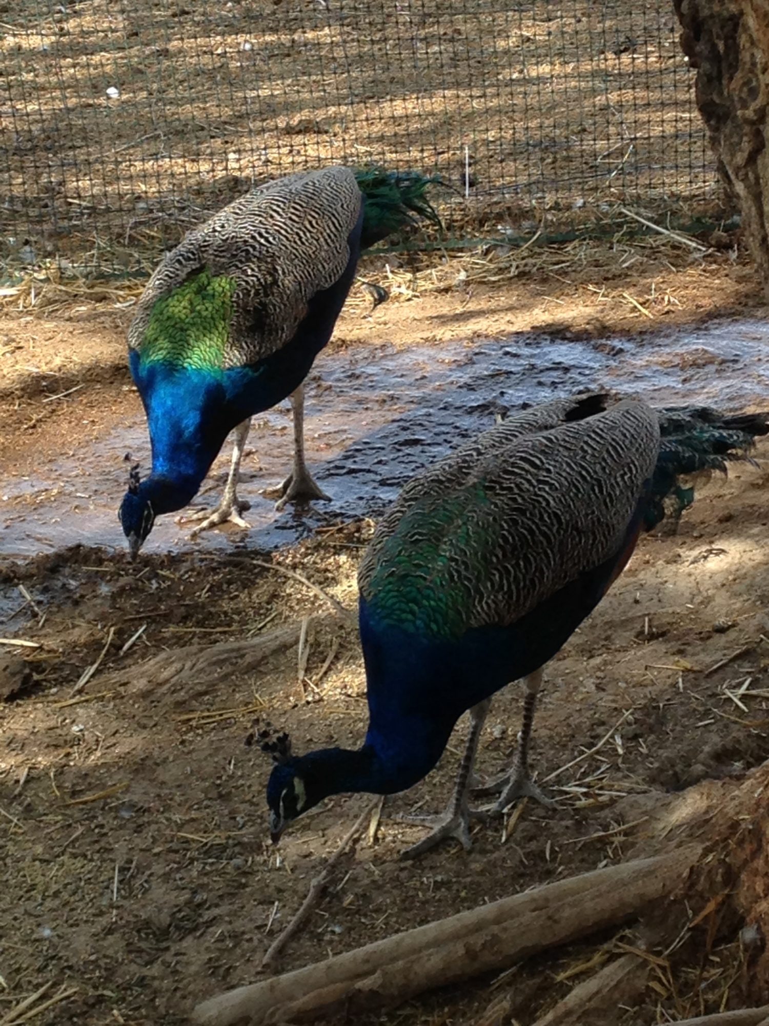 Here is a picture of 2 of my peacocks that are just getting their pretty feathers in: