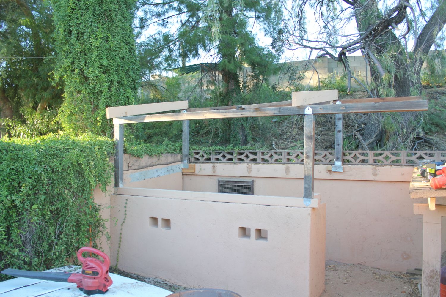 We tore off the roof, which was comprised of plywood topped with tar paper "shingles" as well as took down the support beams and hardware to reuse for the higher roof later on.