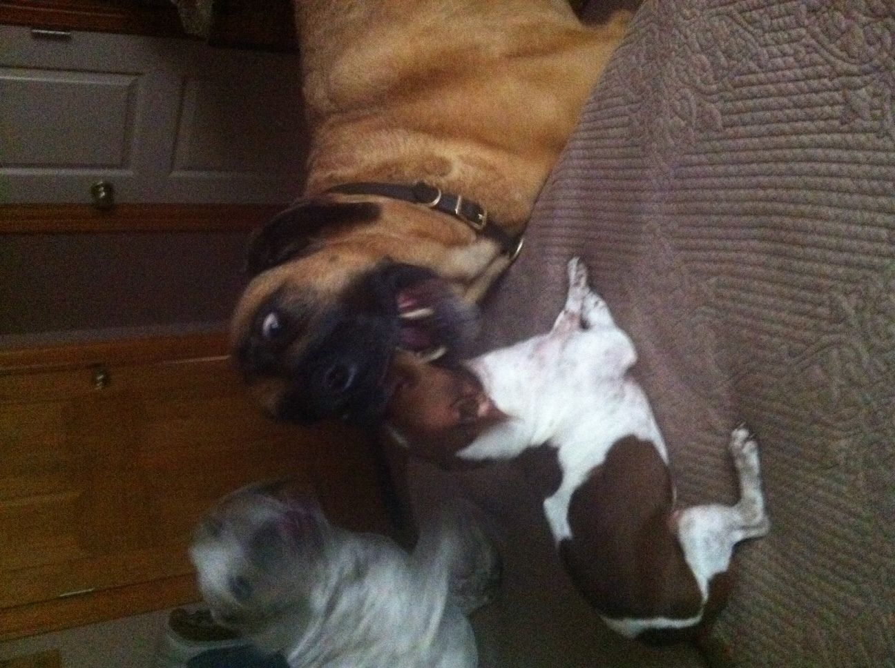 Here is a photo of group play with the prey-sized rescue. The Basset-mix kitty eater is on the bed with the rescue while the Mastiff/Dane mix is standing next to the bed. ALL the dogs were exceedingly gentle while we looked for a home, but I do not have a photo fitting all FIVE into one frame.