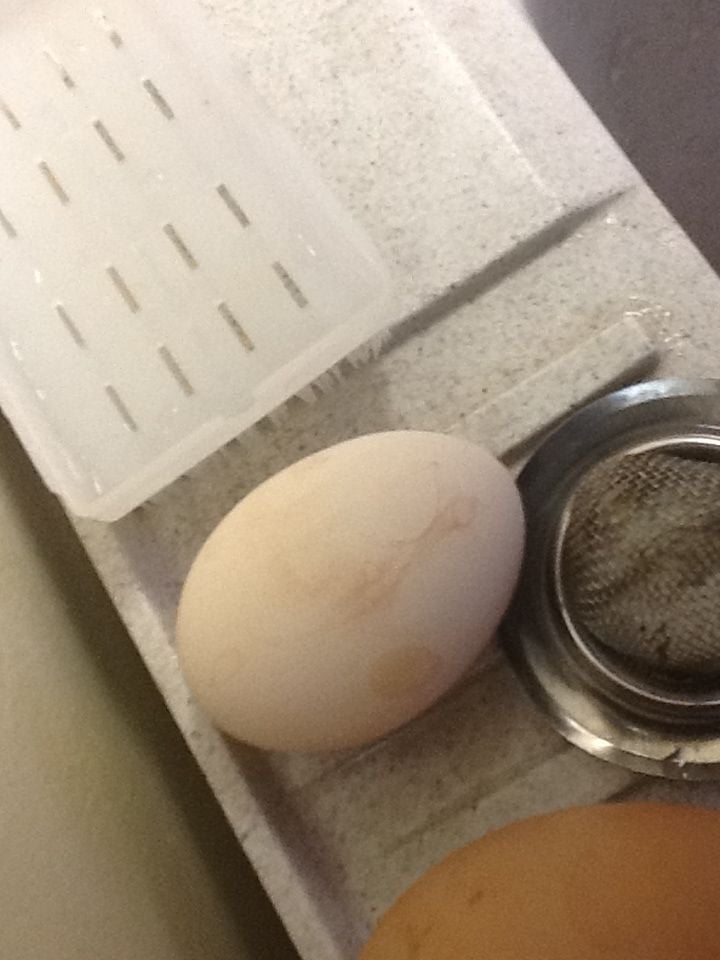 This is the lone bantam egg I found in the coop this morning. I have 3 bantam hens in total - the affected pullet and two 6 year olds. This egg has a tiny bit of blood on it, which I have seen before on other eggs. It could have come from the hen with the prolapse: